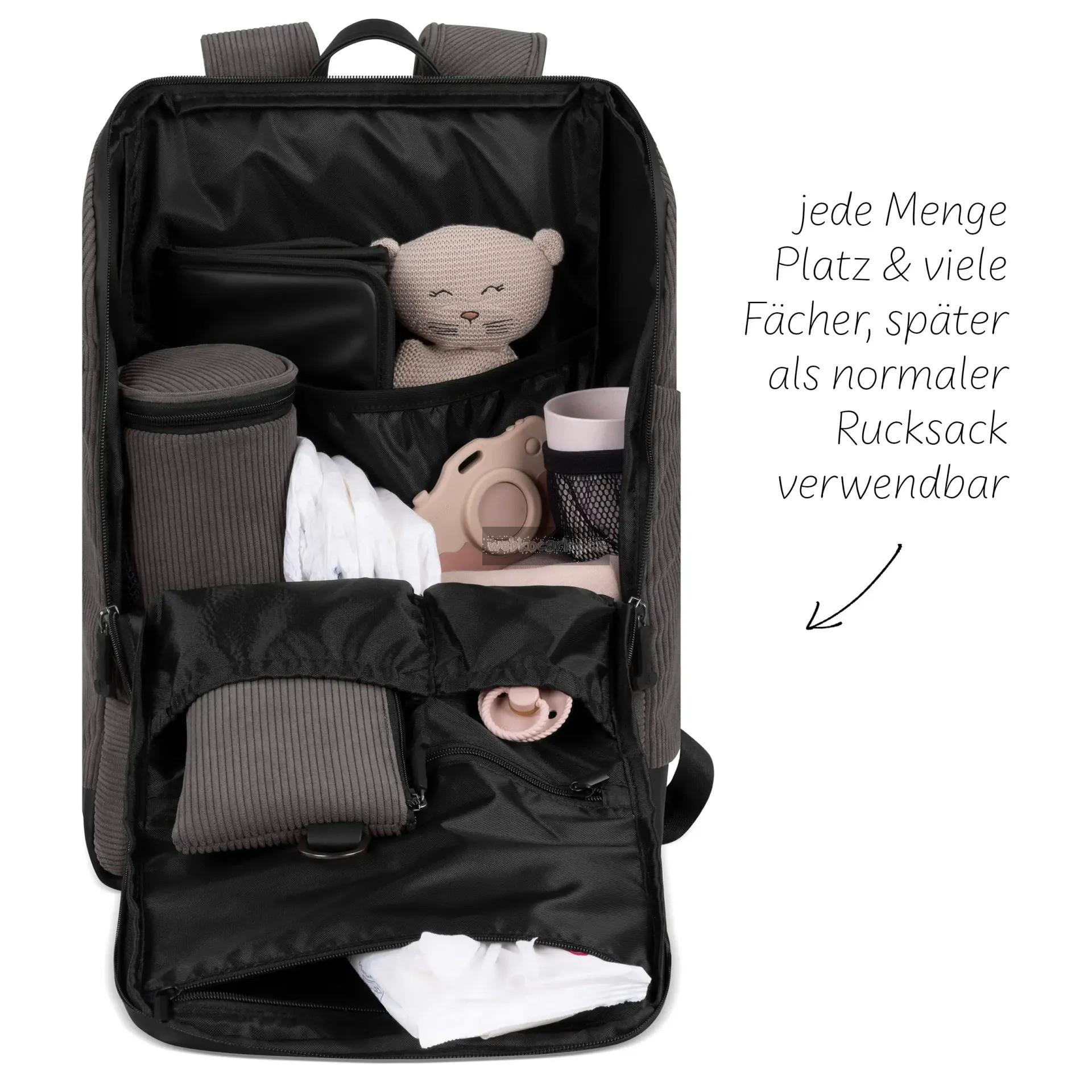 Batoh také obsahuje přebalovací podložku na cesty, kapsu na sáčky a termoobal na lahve. Hlavní přihrádka, otevíraná zepředu, poskytuje dostatek prostoru pro všechny vaše věci, ať už se jedná o nákupy, nebo věci na dlouhou procházku. Díky popruhu na zádech je batoh také snadno přenositelný a praktický pro cestování.