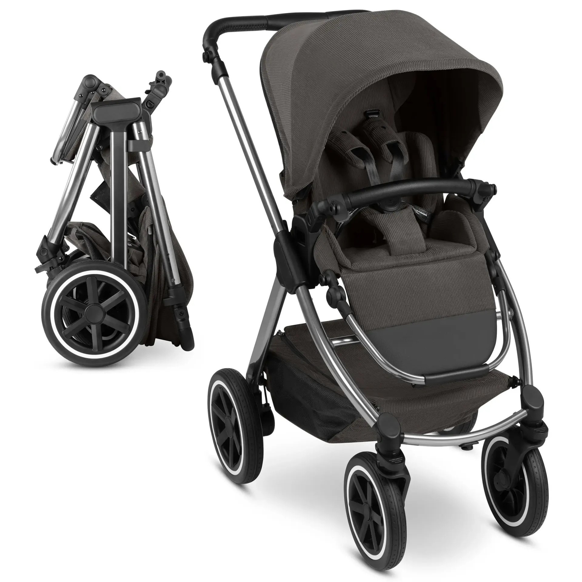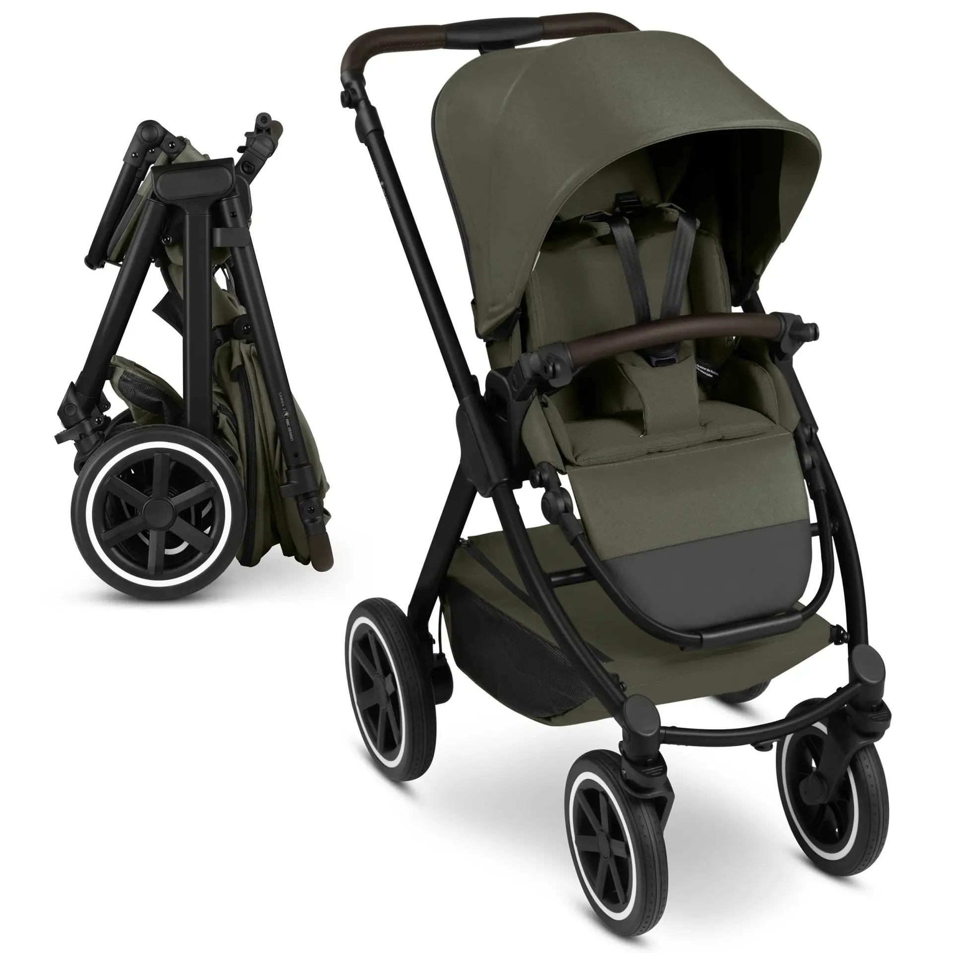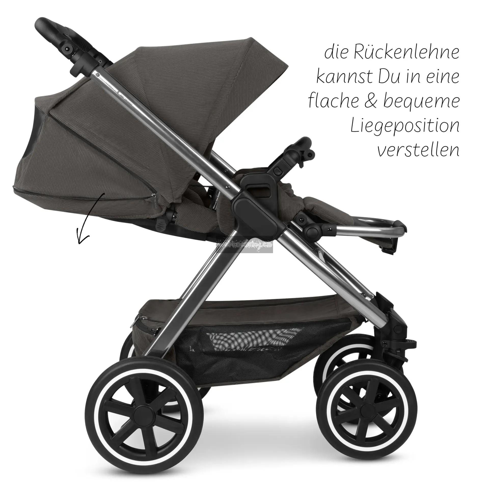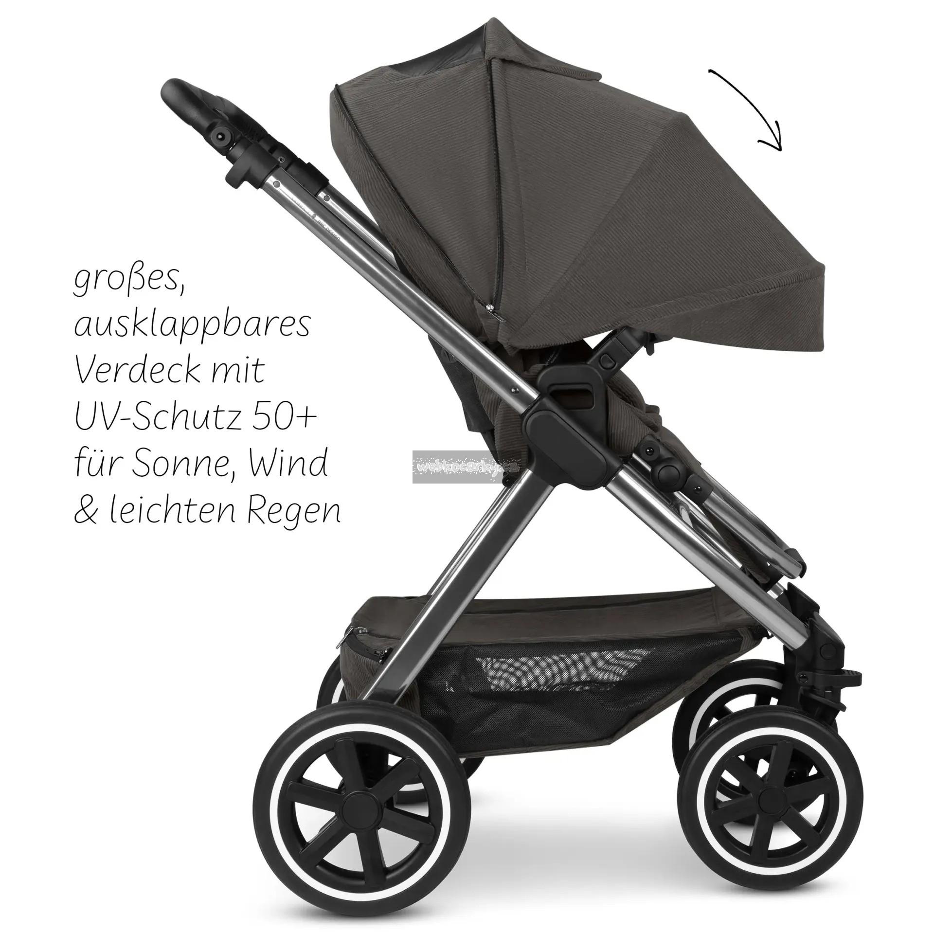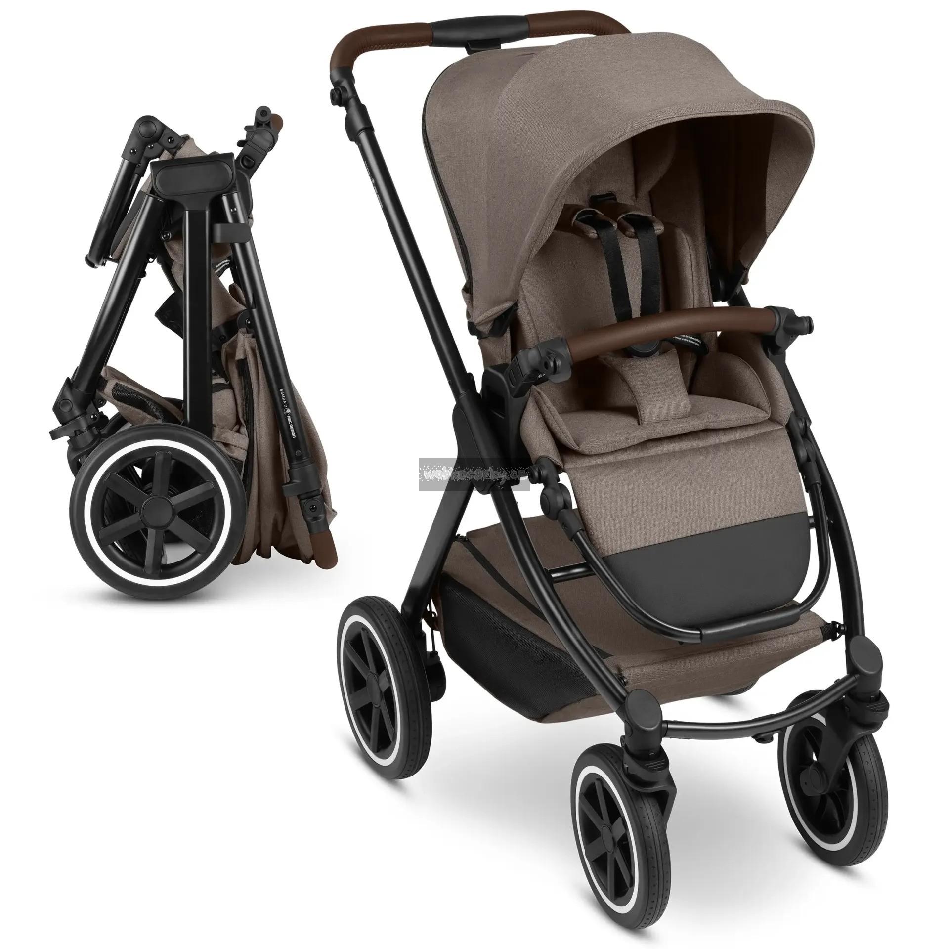 Chytré: Parkovací brzda je umístěna přímo na pravém zadním kole. Tím odpadá potřeba zadní nápravy. To šetří hmotnost a prostor a zároveň zvyšuje komfort tlačení. S volitelnou korbičkou / k dokoupení / pro kočárek Samba 2 vás vaše děťátko může doprovázet od narození.