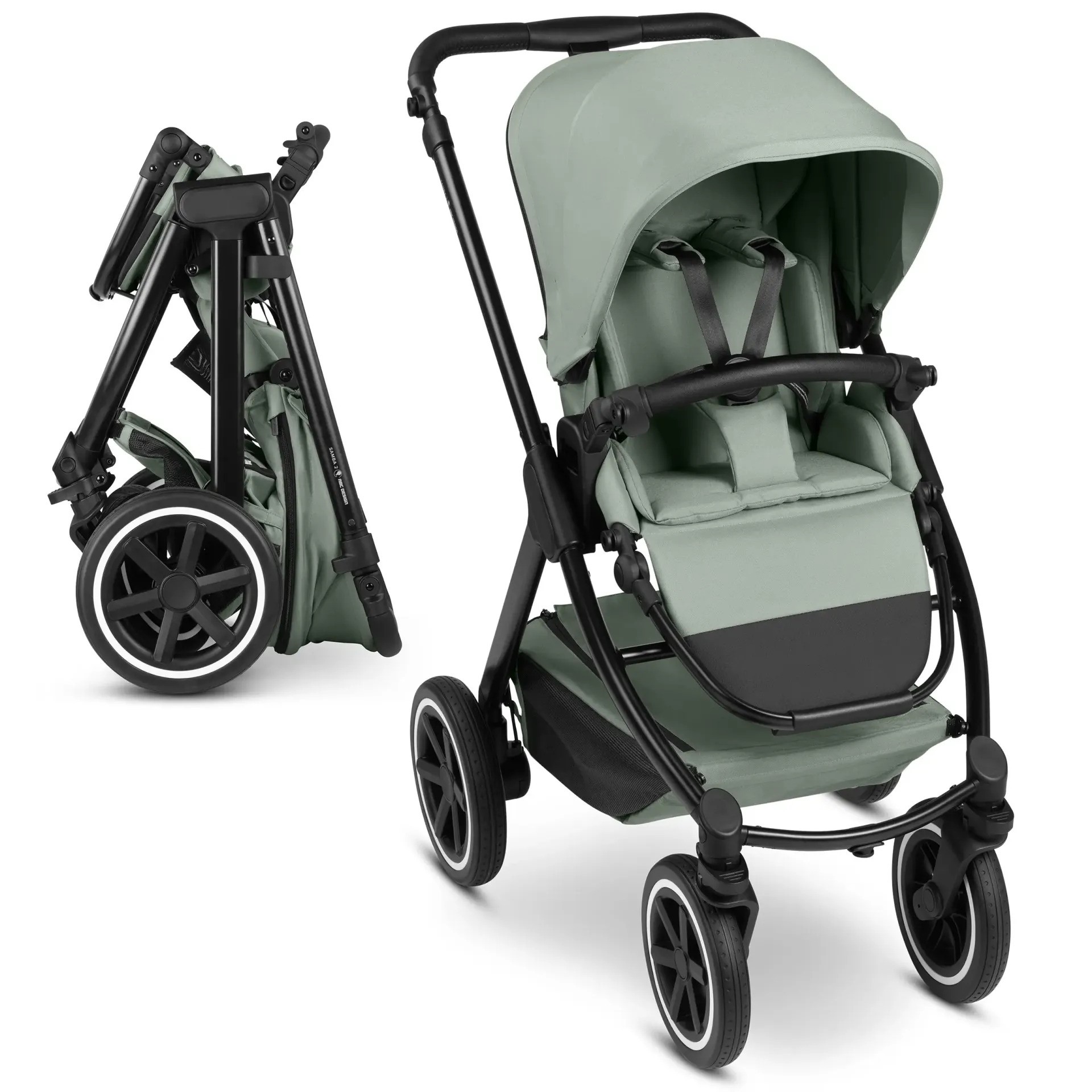 Díky své kompaktní skládací velikosti je Samba 2 velmi malá pro přepravu. Pro úsporu místa jej můžete uložit do kufru vašeho auta nebo si jej snadno vzít s sebou do autobusu či vlaku. A pokud se potřebujete rychle přesouvat, můžete Sambu 2 rychle složit i se sedačkou – bez ohledu na to, zda je sedačka čelem k vám nebo dopředu.