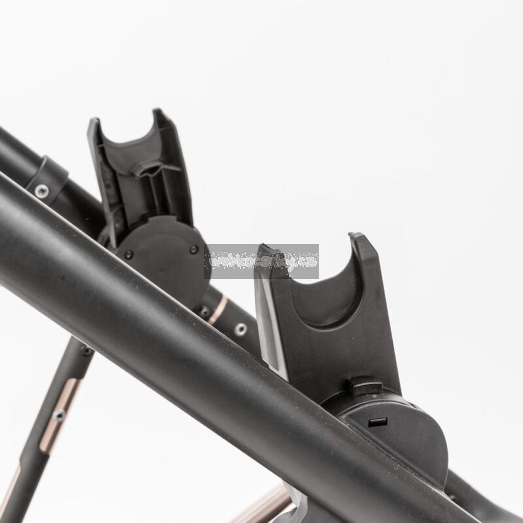 - Umístěte adaptéry do montážních štěrbin rámu kočárku, dokud nezaklapnou – moment zacvaknutí prokáže správnou instalaci.
