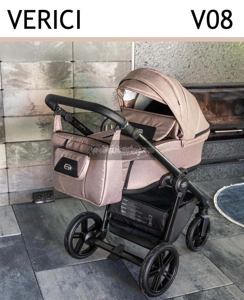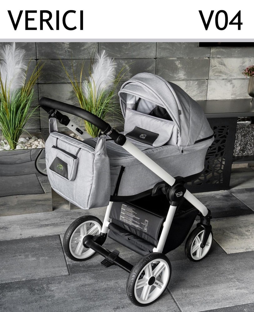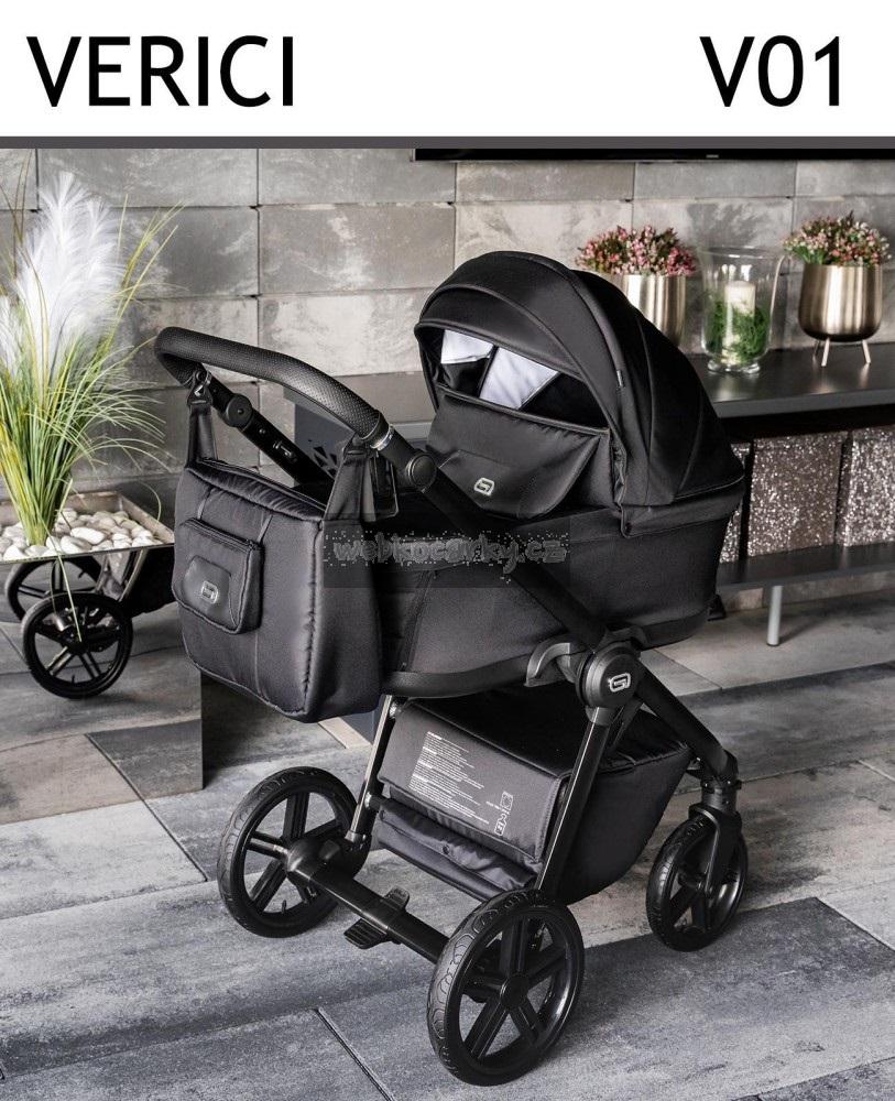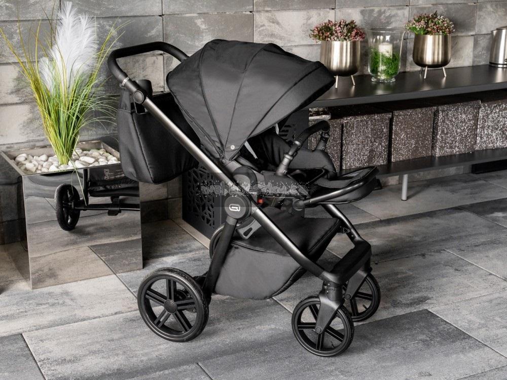 Elegantní kombinovaný kočárek se skládá z podvozku s koly, hluboké korby, sportovní nástavby a autosedačky.