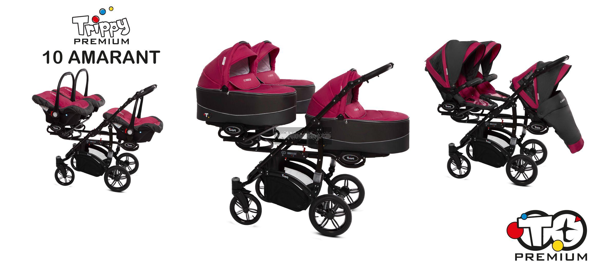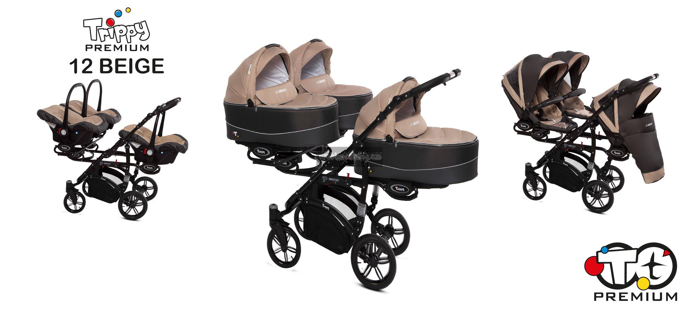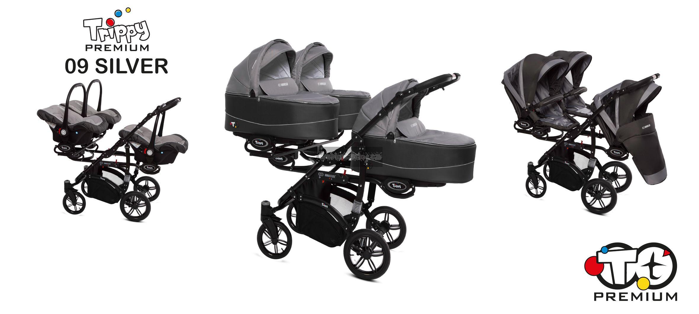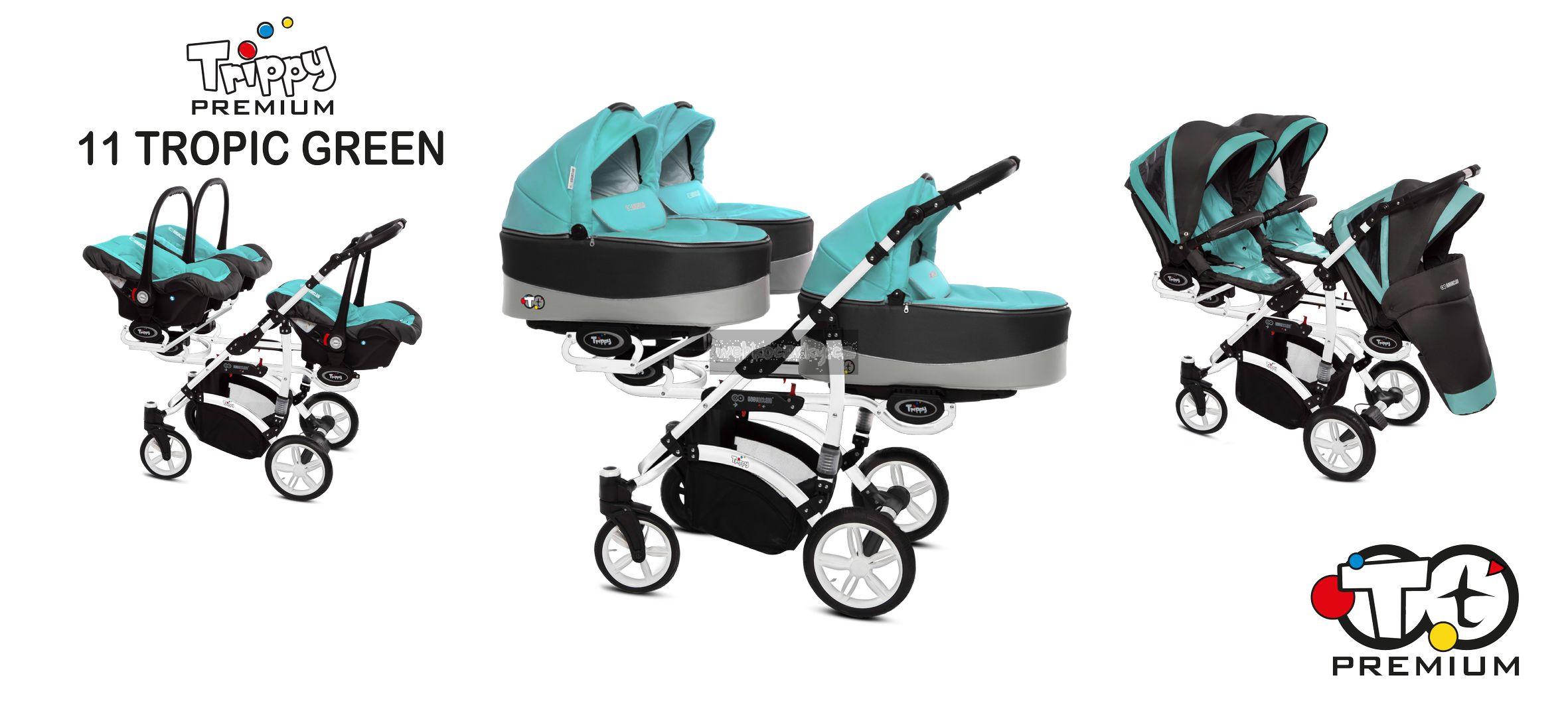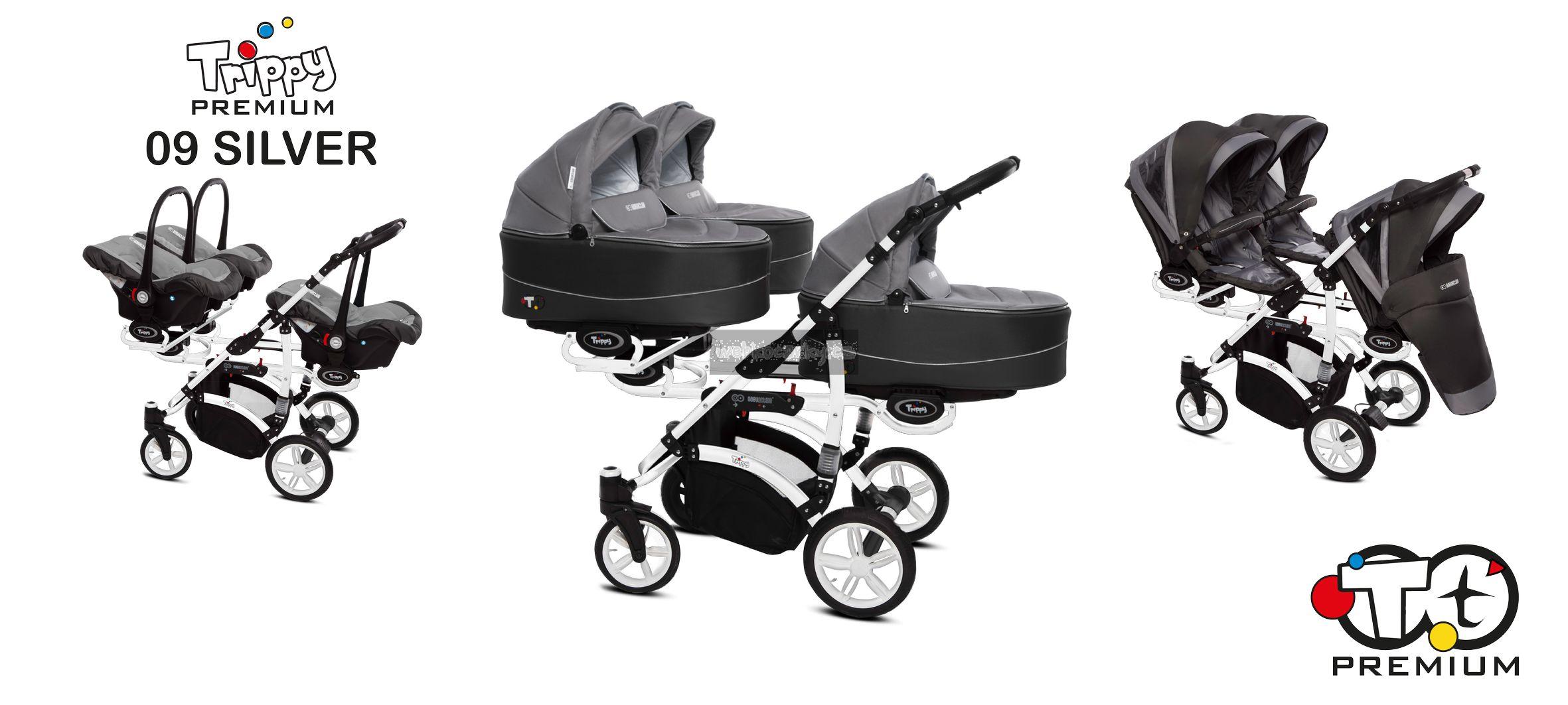 Luxusní kombinovaný kočárek pro trojčátka, nebo sourozence. Velmi dobře odpružený a snadno ovladatelný. Váha konstrukce pouze 8,5 kg. Kočárek lze zakoupit jako 2v1, nebo jako 3v1 a to včetně autosedačka s adaptérem pro možnost vození na konstrukci kočárku. U kočárku Trippy lze libovolně kombinovat korbičky či sportovní verze či autosedačky.