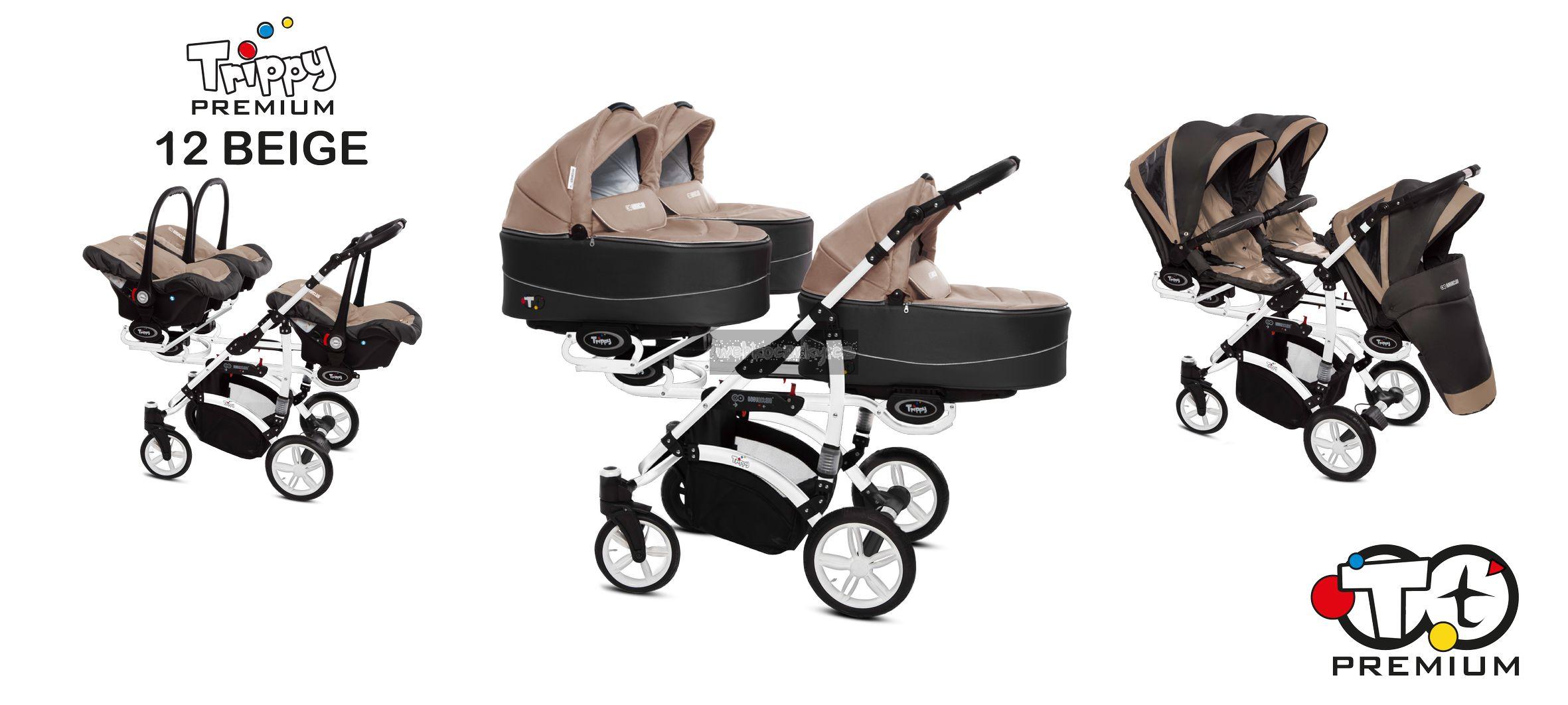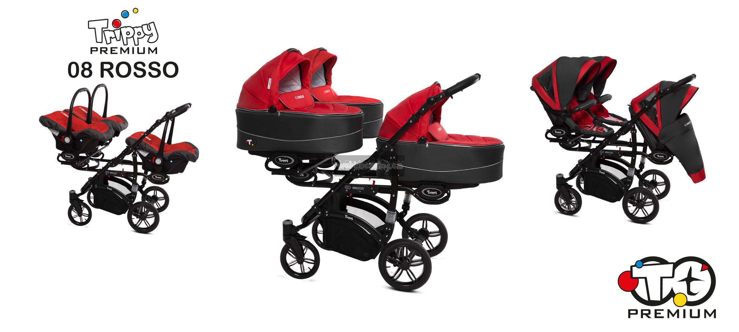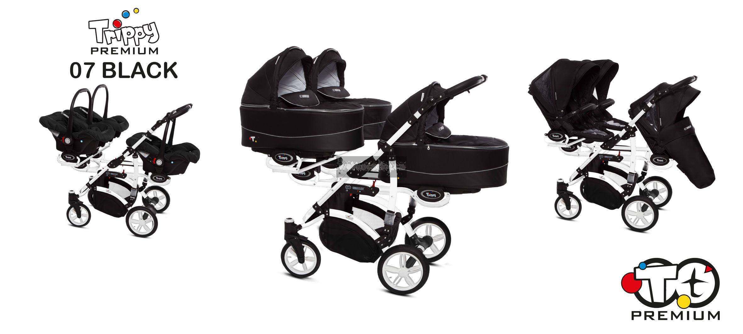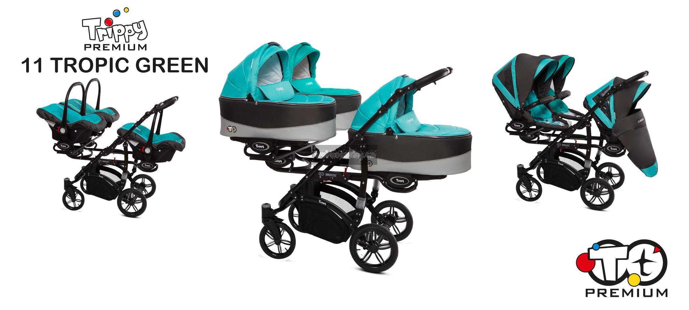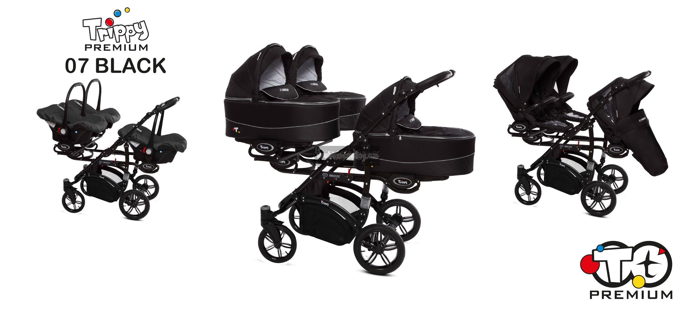 Luxusní kombinovaný kočárek pro trojčátka, nebo sourozence. Velmi dobře odpružený a snadno ovladatelný. Váha konstrukce pouze 8,5 kg. Kočárek lze zakoupit jako 2v1, nebo jako 3v1 a to včetně autosedačka s adaptérem pro možnost vození na konstrukci kočárku. U kočárku Trippy lze libovolně kombinovat korbičky či sportovní verze či autosedačky.