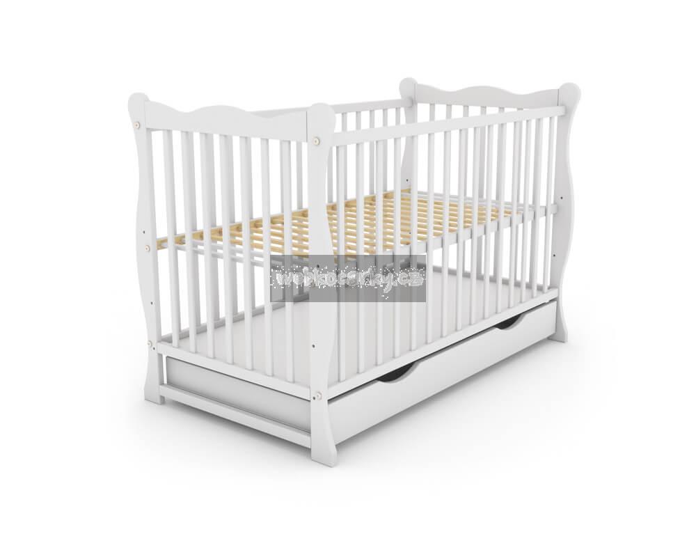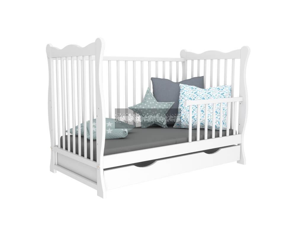 Dětská postýlka Julia z borovice v bílé barvě •dětská postýlka z borovice•bočnice včetně příček jsou ze dřeva•tři příčky jsou vyndavací•výšku roštu lze nastavit do tří poloh•nejvyšší polohu roštu je možno použít pouze pro nesedící dítě•vnitřní rozměr 120 x 60 cm Matrace, šuplík a bariéra nejsou součástí postýlky, jedná se pouze o ilustrační fotky.