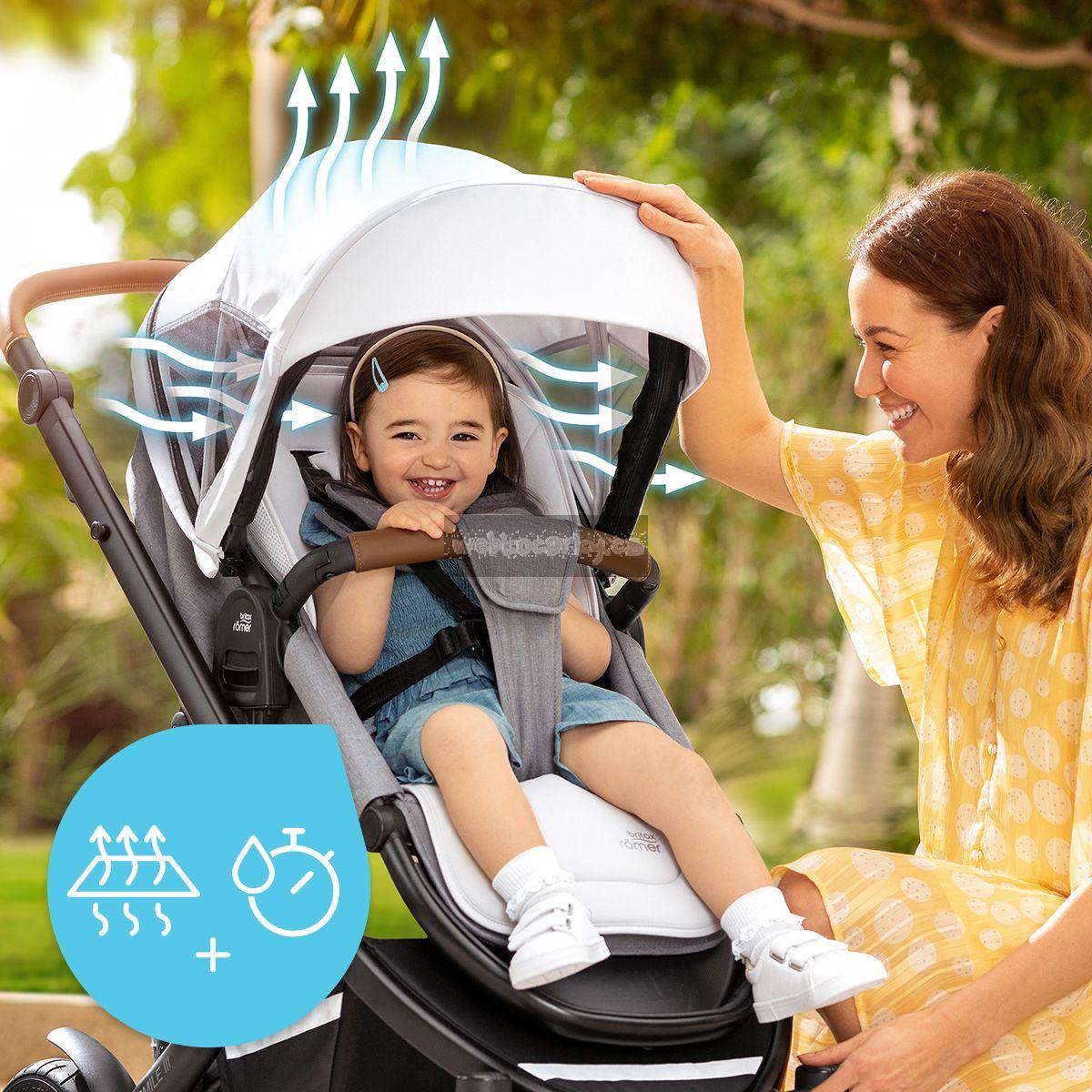 Užijte si léto naplno! S extra širokou stříškou Stay Cool, kterou lze ještě libovolně rozšířit, ostrý letní sluneční svit nepředstavuje pro vaše dítě žádný problém. Důmyslný systém ventilačních otvorů zajišťuje optimální cirkulaci vzduchu, díky čemuž se teplota uvnitř kočárku i během horkých letních dnů nezvyšuje. Součástí stříšky je i vestavěná síť proti hmyzu, která dítě chrání před nezvanými návštěvníky.