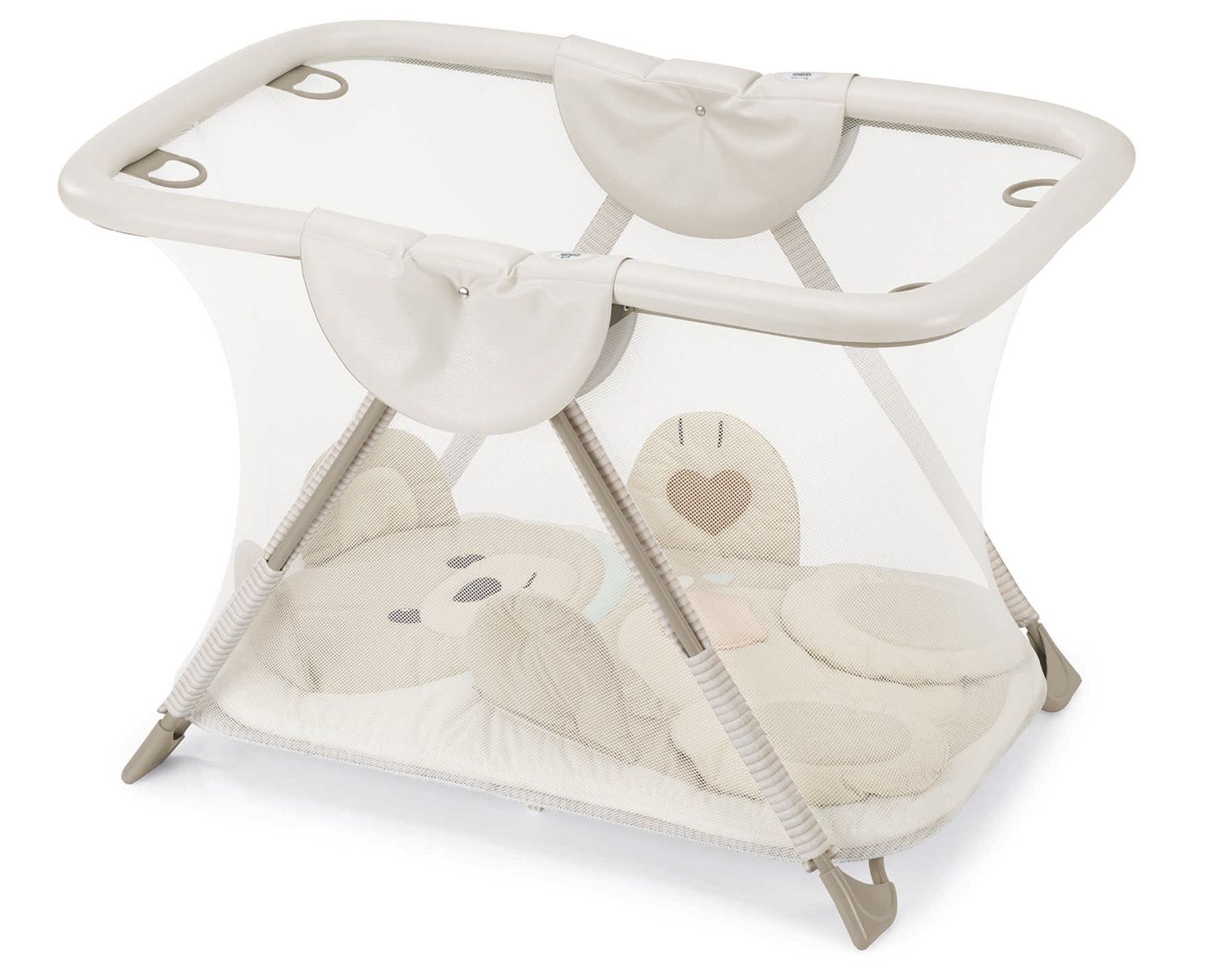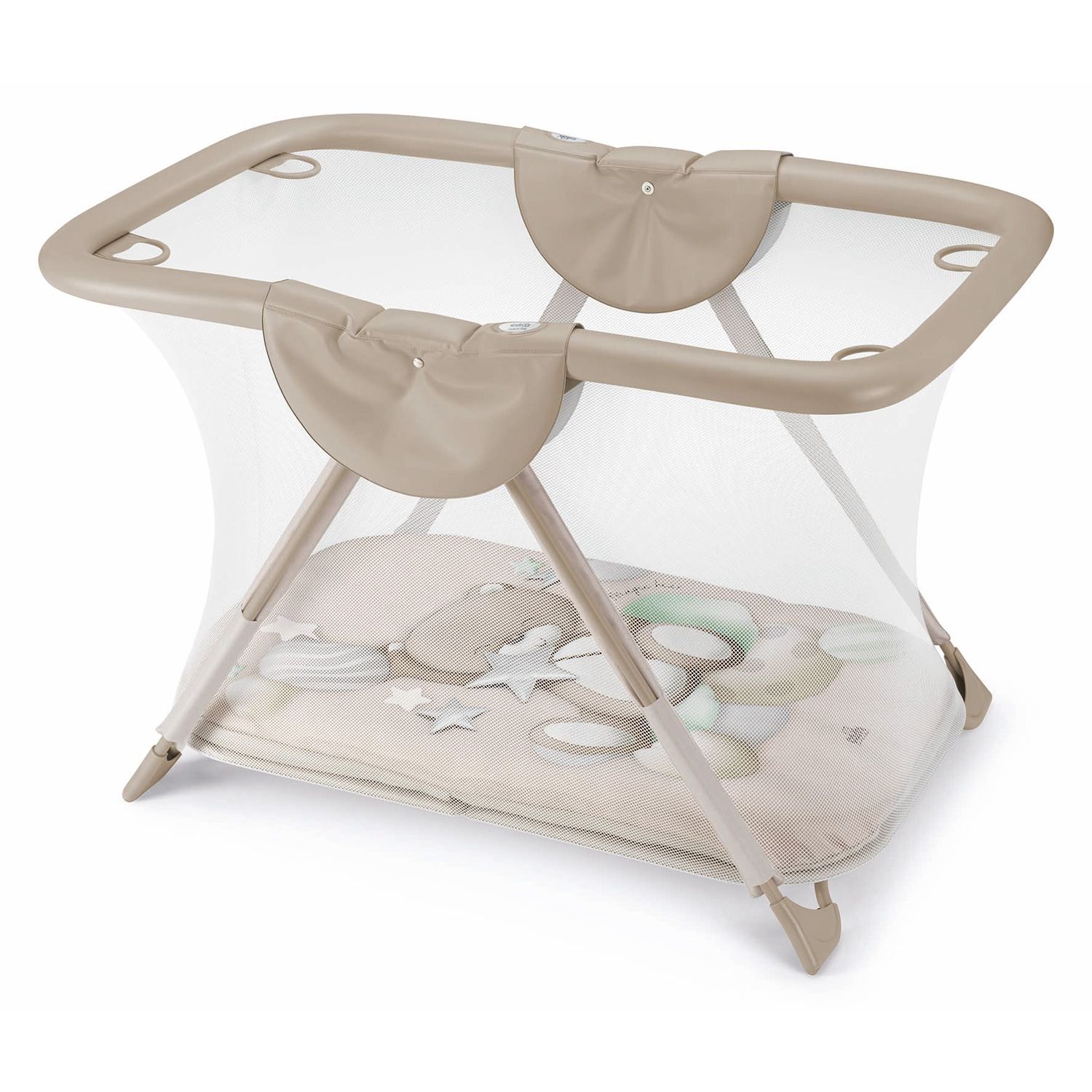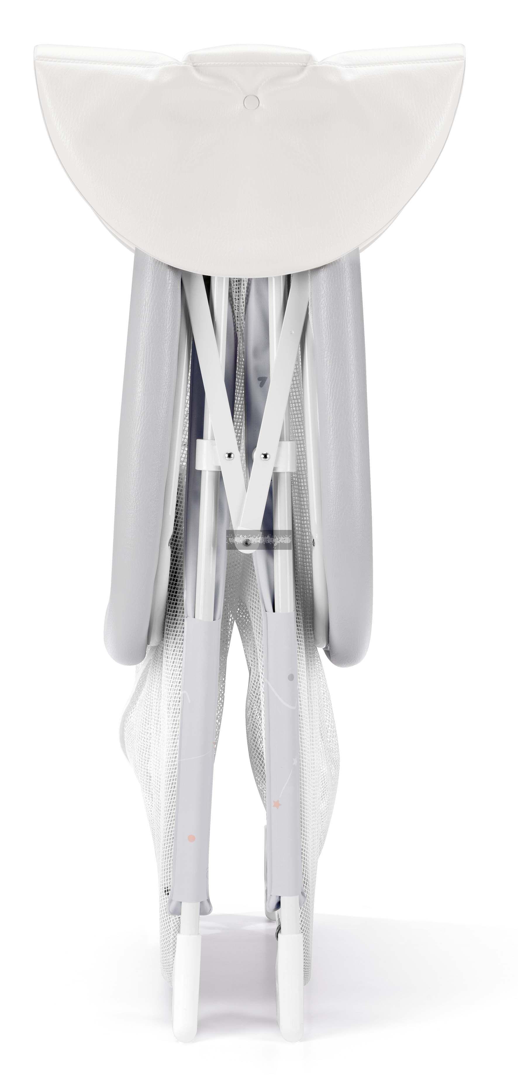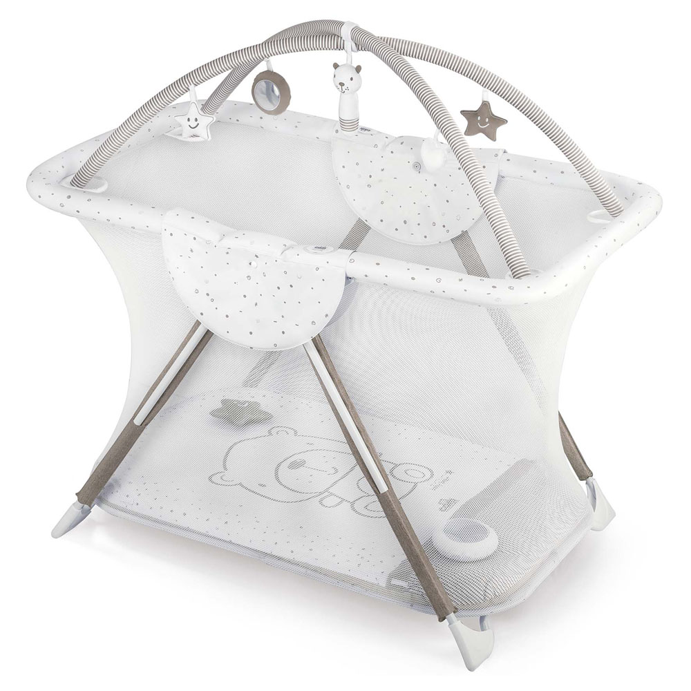 - Obsahuje měkkou hrací plochu s hračkami s interaktivními funkcemi (měkké odnímatelné hračky, malé zrcadlo, šustivý prvek, chrastítko)