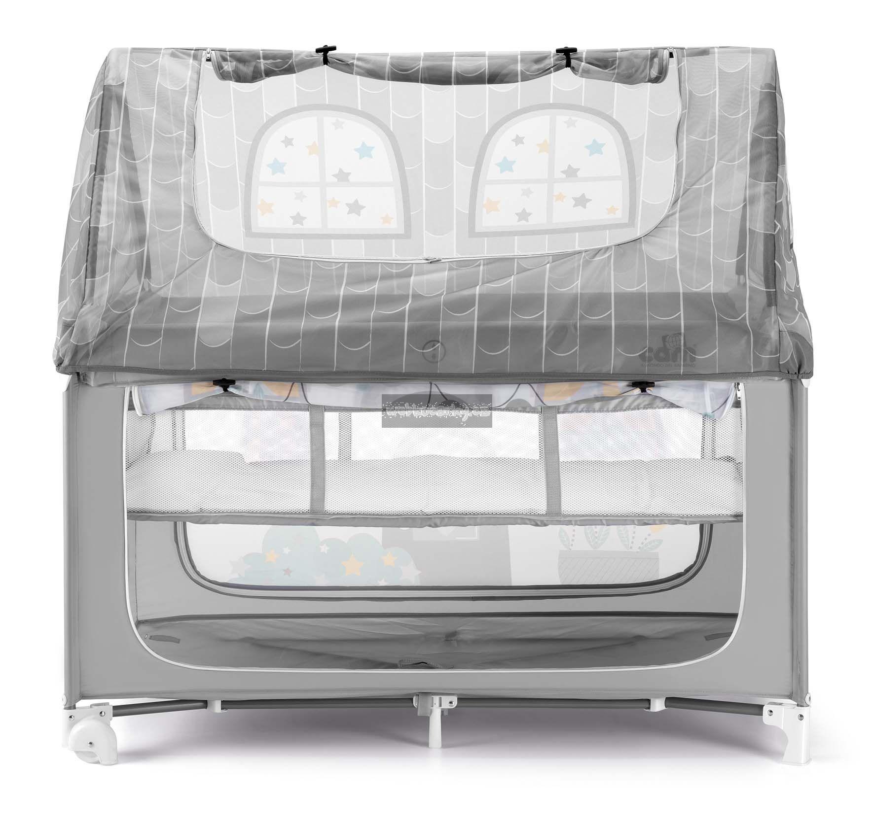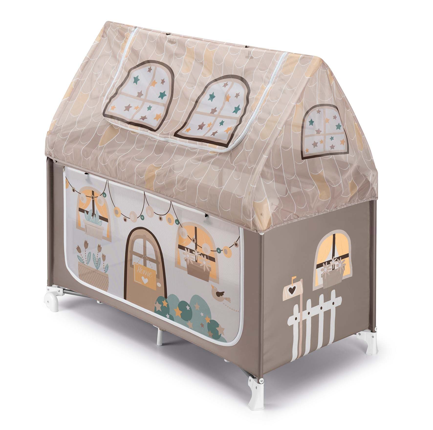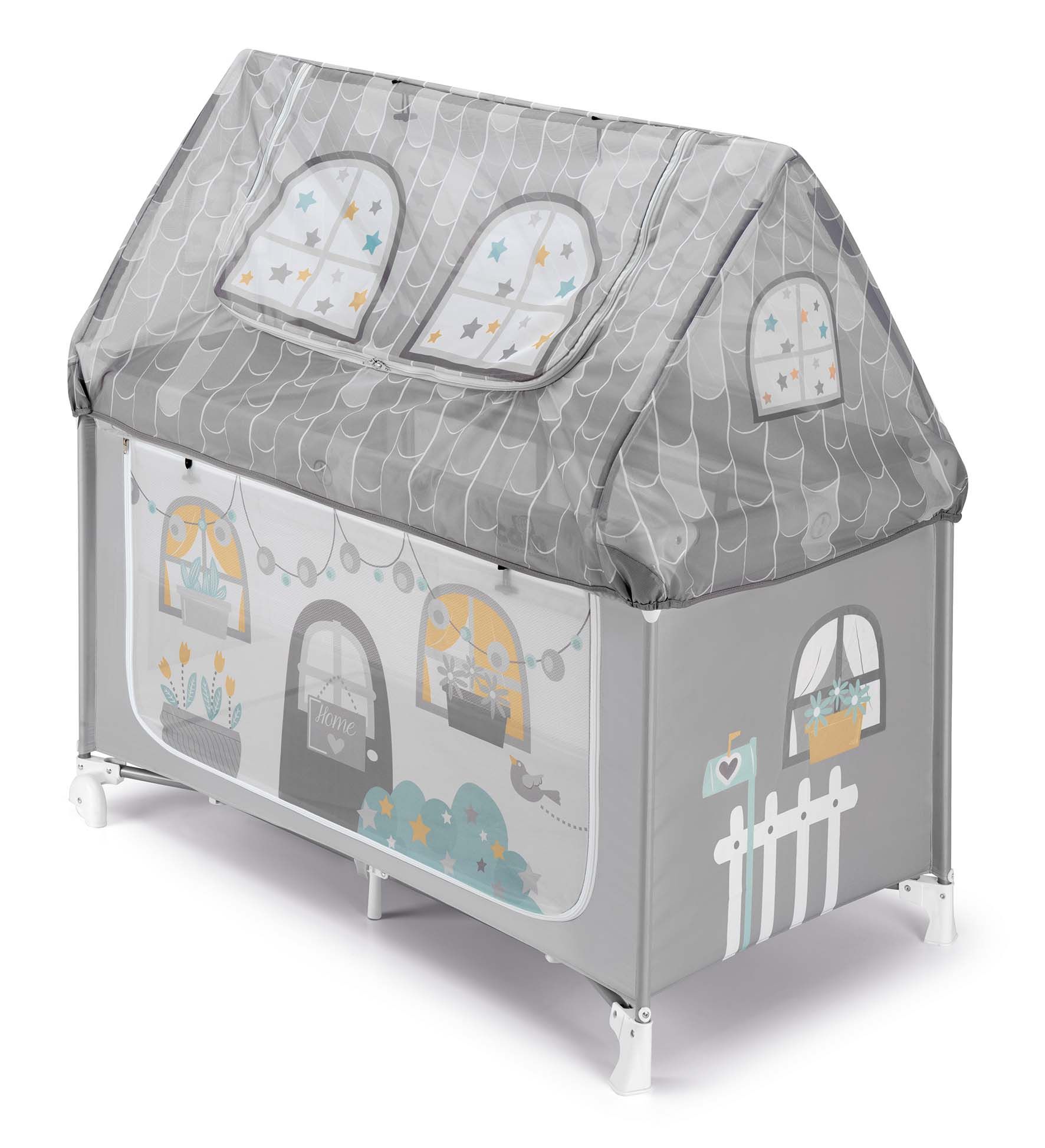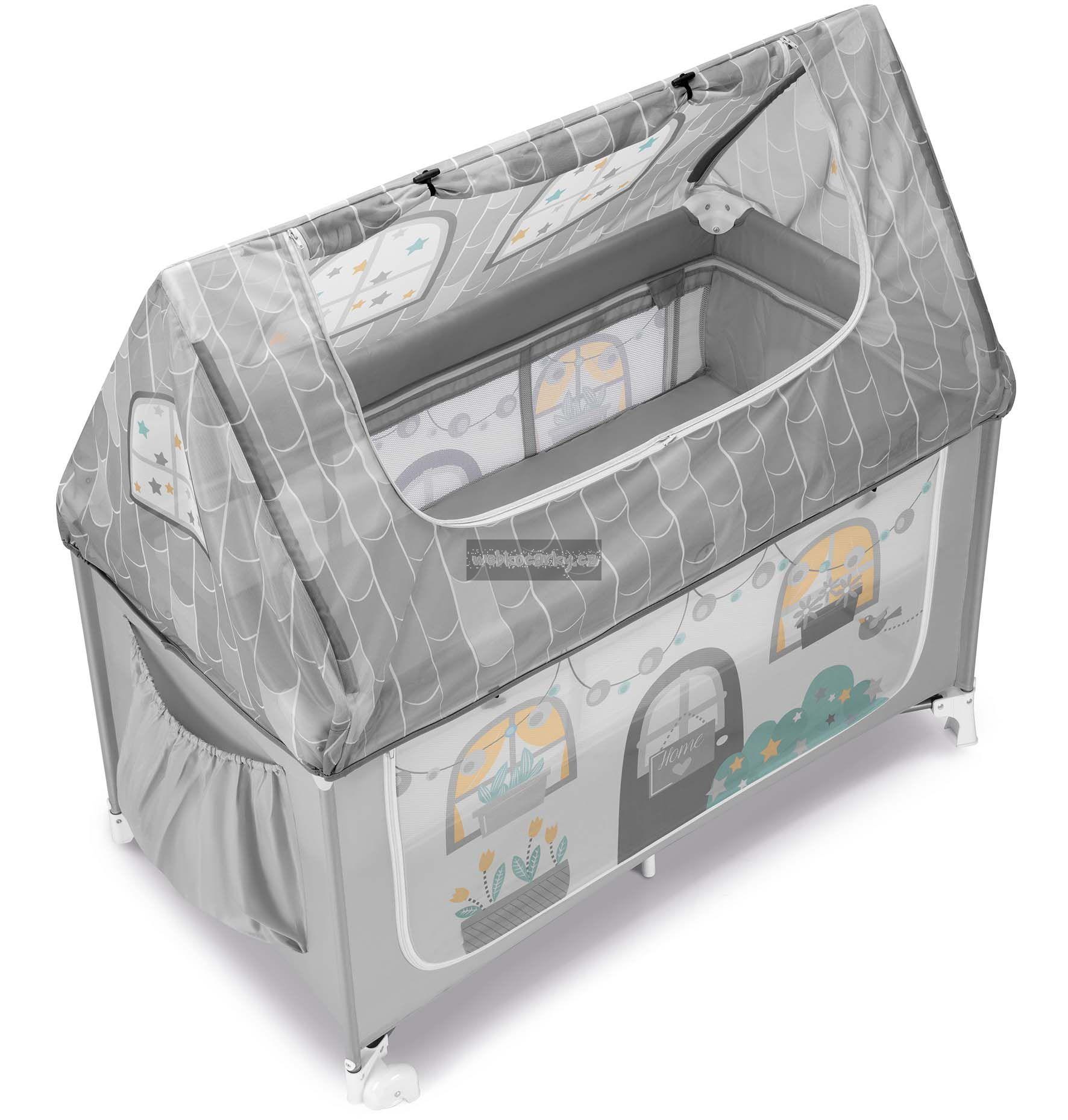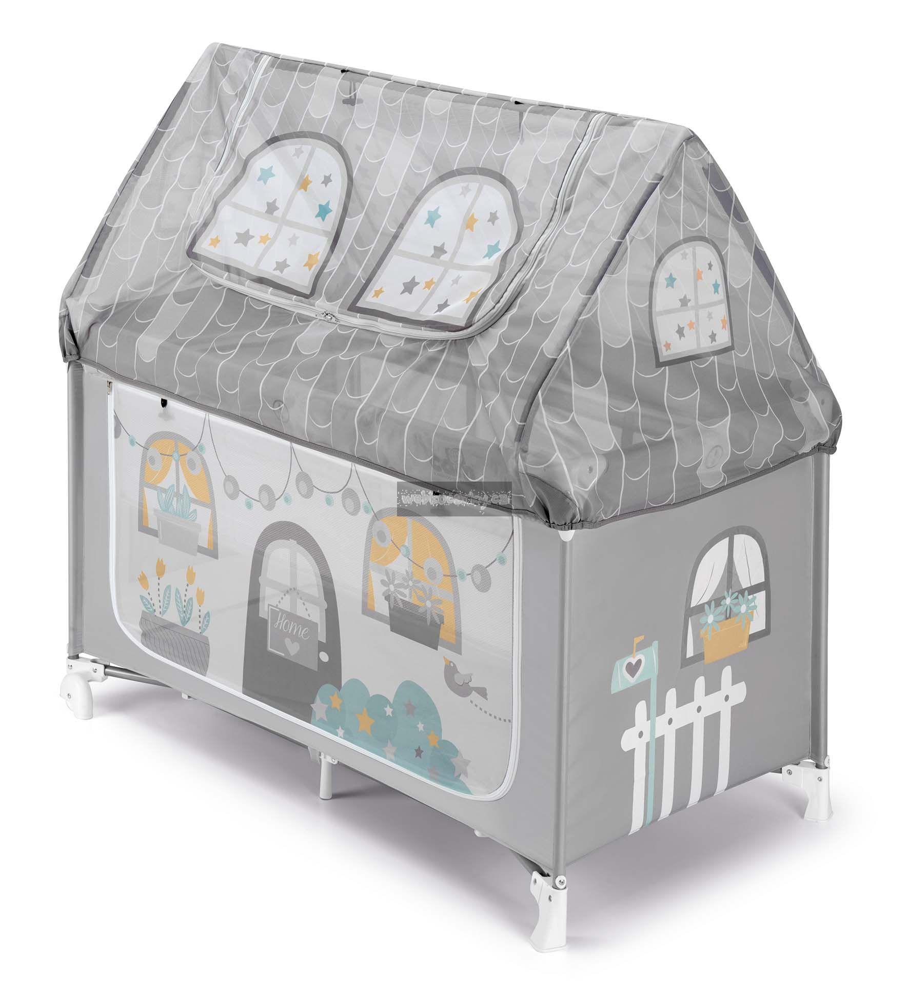 Oba boky domečku jsou rozepínací a jsou ušité z průsvitného síťovinového materiálu, takže na dítě vždycky uvidíte a snadno se k němu dostanete. Další přístup k dítěti je skrze stříšku domečku, která se dá vyhrnout nahoru.