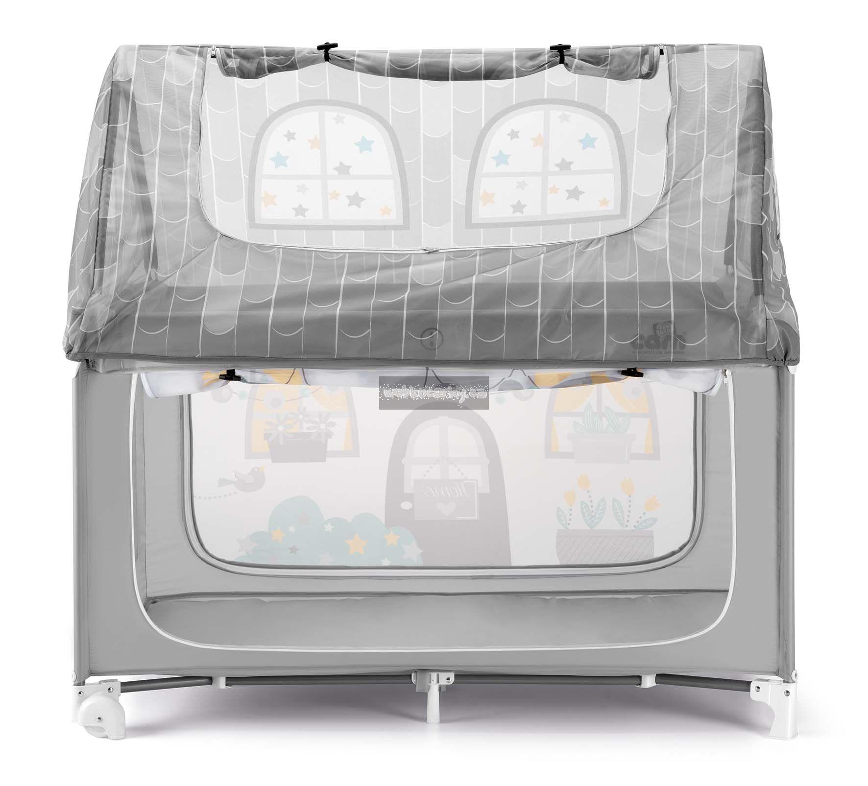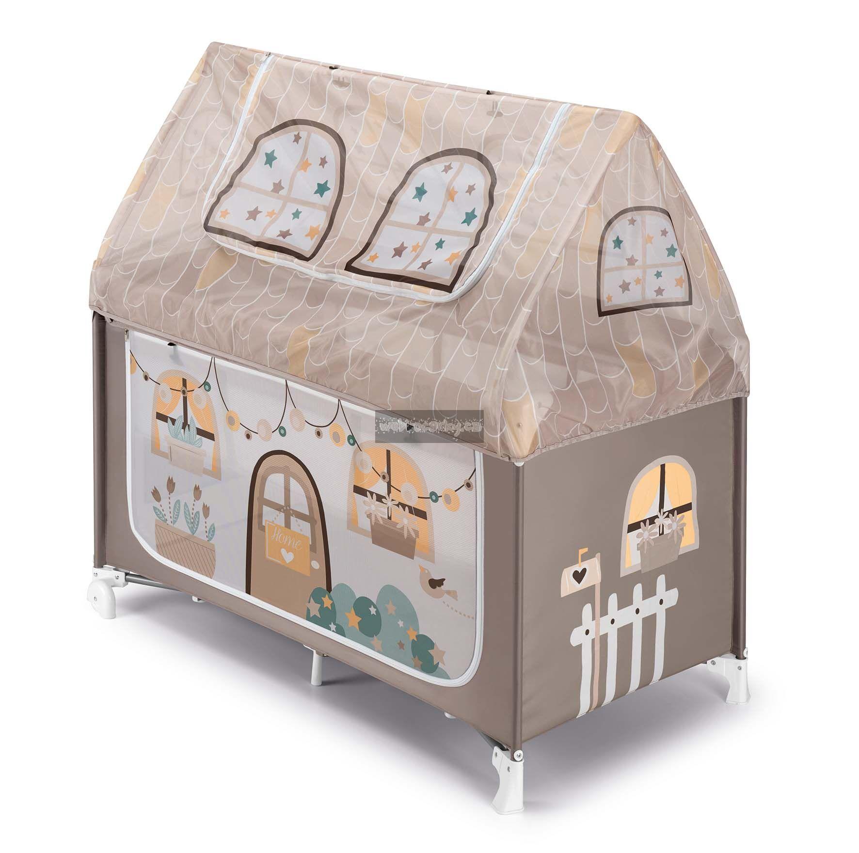 Uvnitř ohrádky je měkká komfortní matrace. Pro nejmenší děti, které zatím jen leží, lze zvednout spodek ohrádky do její poloviny. Domeček je prostorný a po jeho stranách jsou dvě velké kapsy, kam lze uložit hračky či jiné dětské vybavení.