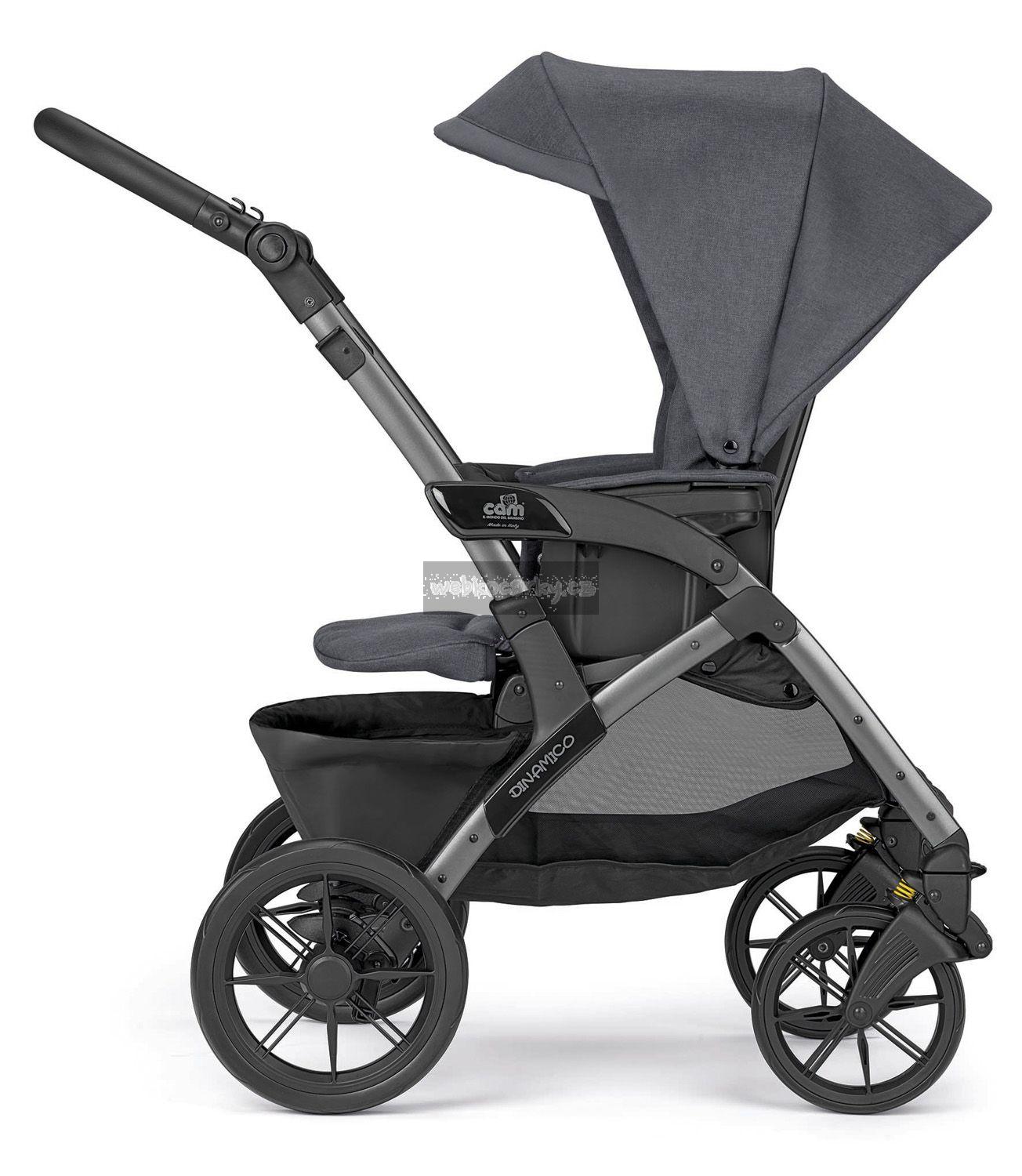 Kočárek Cam Dinamico Smart je vhodný od narození do 3 let. Součástí setu je sportovní kočárek, prostorná korba, autosedačka, nánožník, taška na rukojeť a pláštěnka.