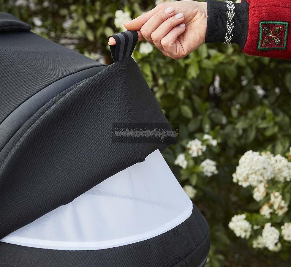 - Pomocí pojistky na spodku korby je možné výškově polohovat hlavičku dítěte.