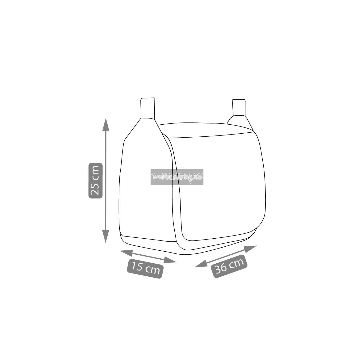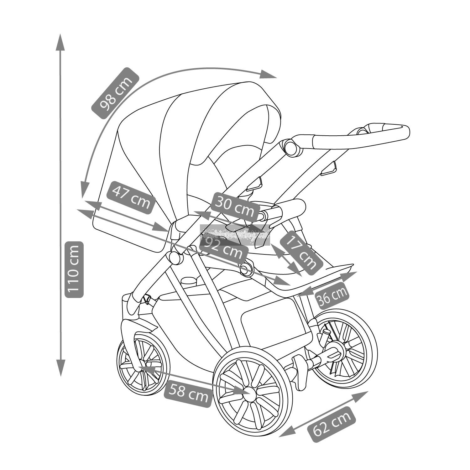 Rozměry: vanička-vnitřní část 86 cm x 38 cm, vanička-vnější část 88 cm x 42 cm (d,š), délka sportovní části 100 cm, nastavitelná rukojeť 74 cm-111 cm, složená konstrukce s koly 82 cm x 60 cm x 30 cm (d,š,v)