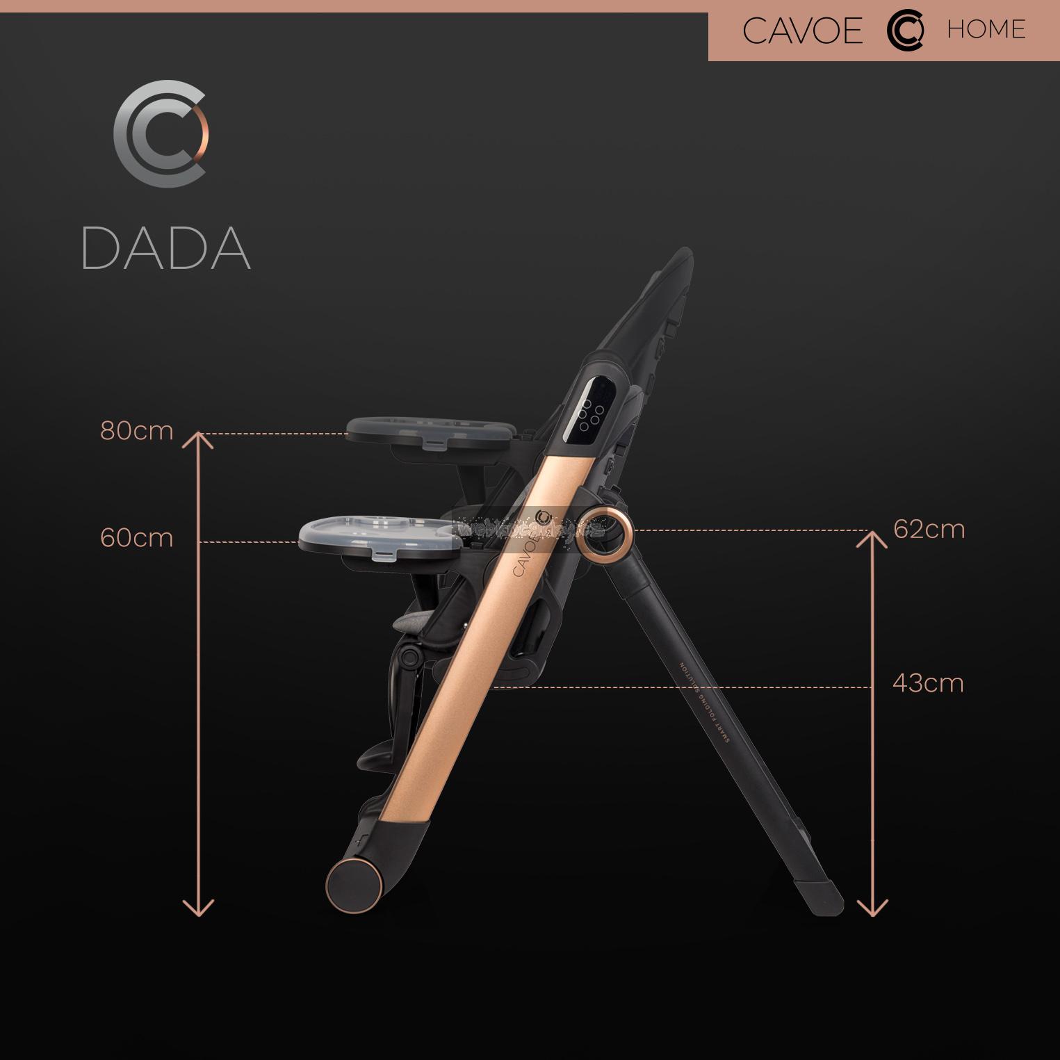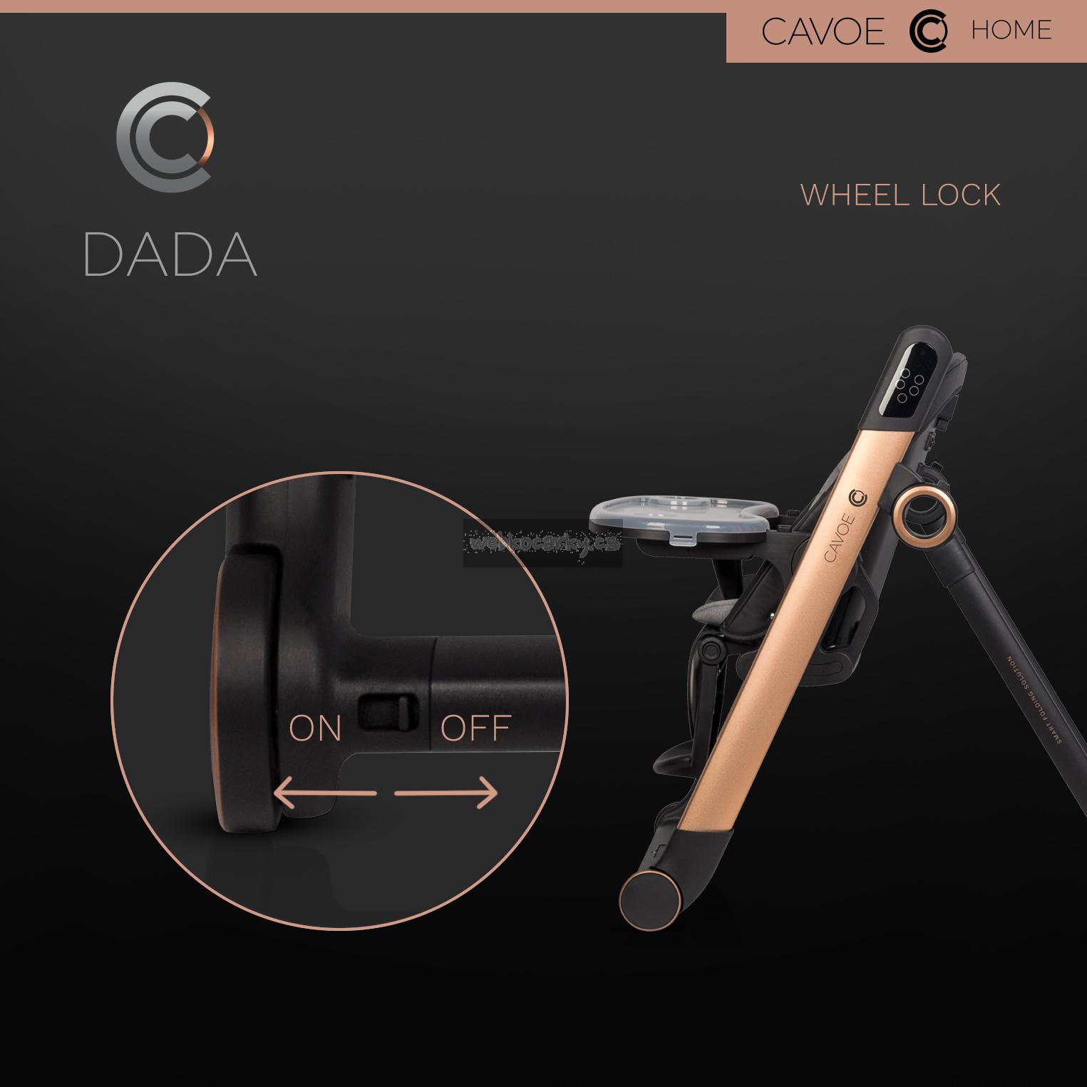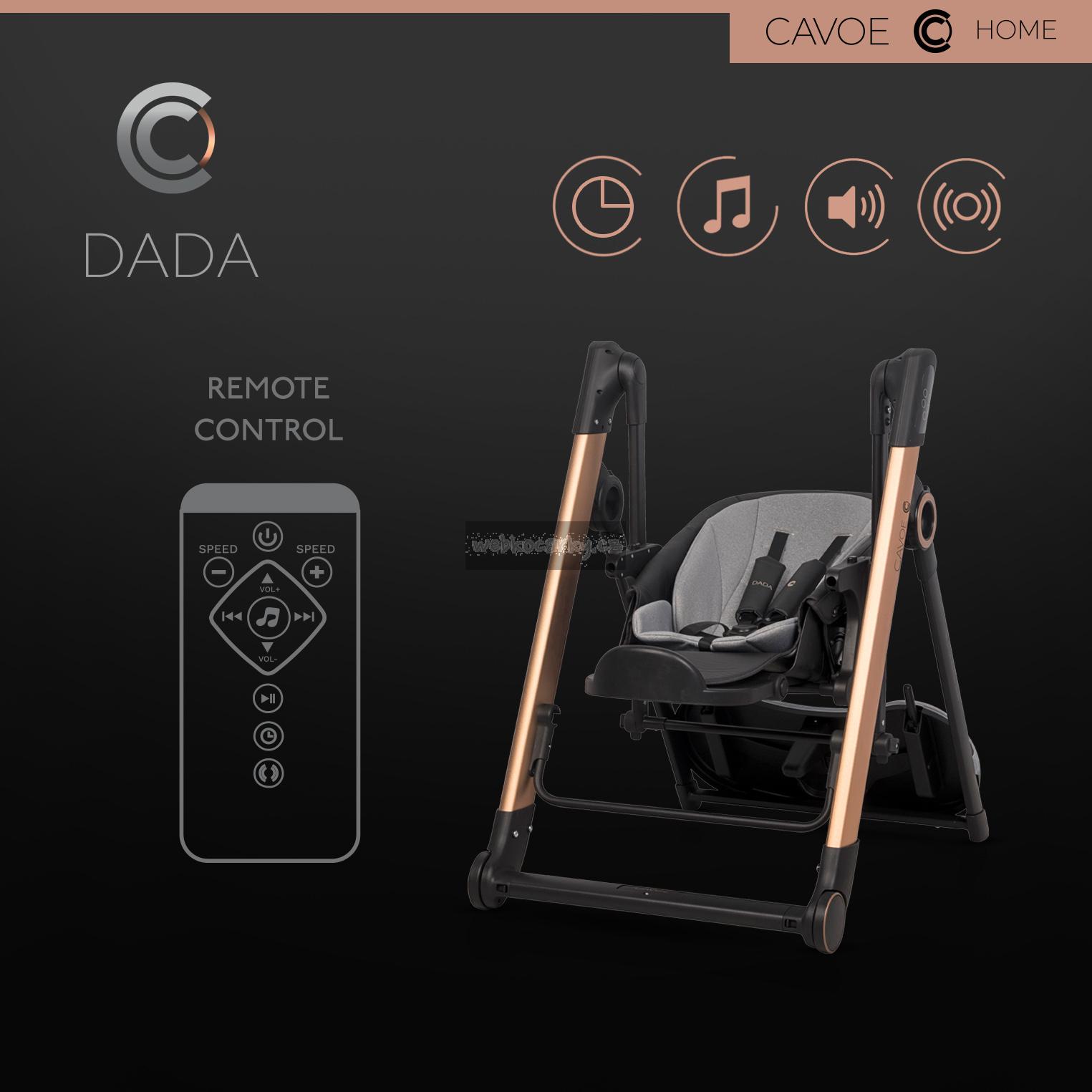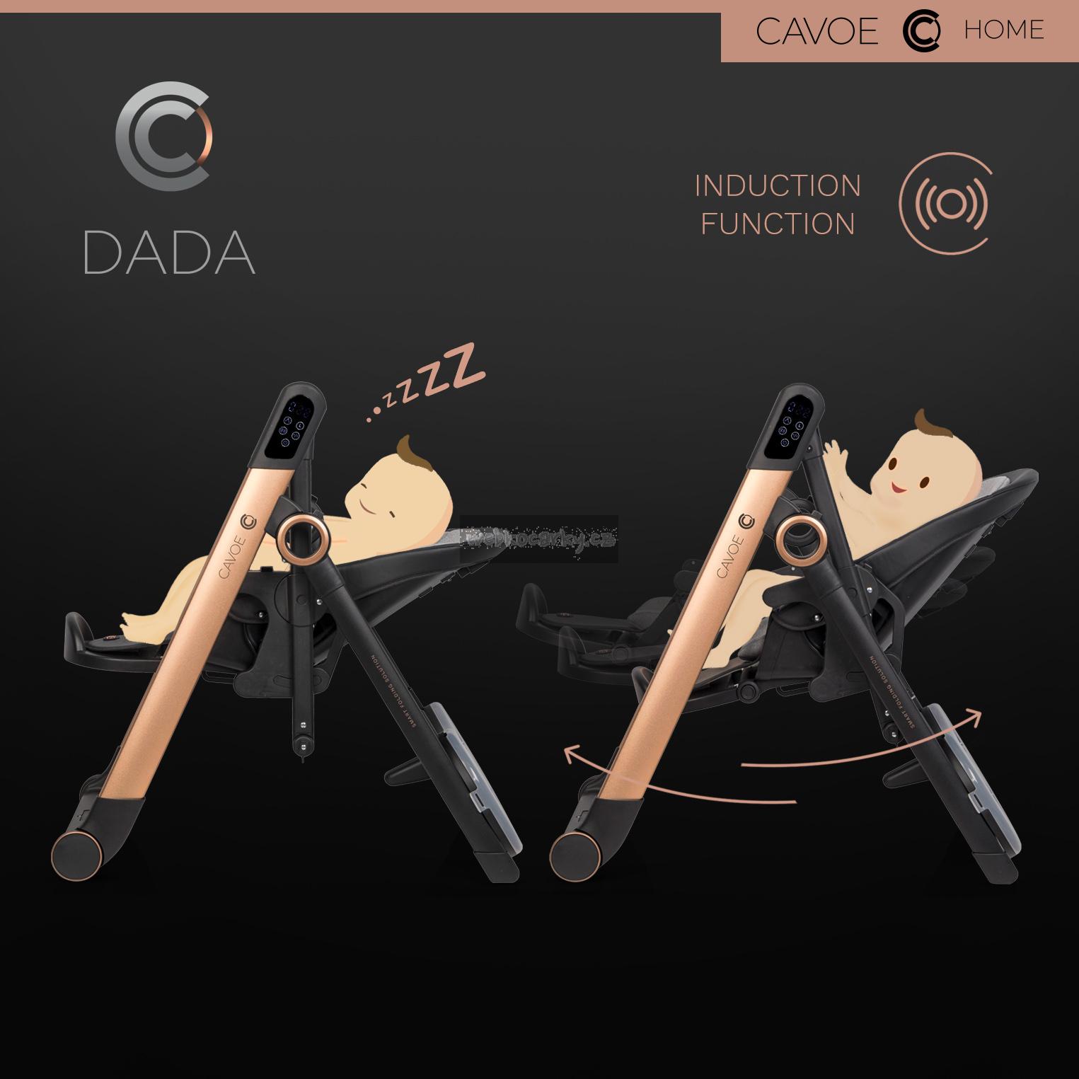 CAVOE DADA je inovativní multifunkční výrobek, který kombinuje funkční vlastnosti s nejmodernější technologií. DADA kombinuje funkce elektrické dětské houpačky a pohodlné jídelní židličky. Jedná se tedy o SMART produkt 2 v 1. Designéři CAVOE se zaměřují na módní styl a moderní formu výrobků, takže DADA má nejen utilitární funkci, ale může být také ozdobou vašeho domova.
