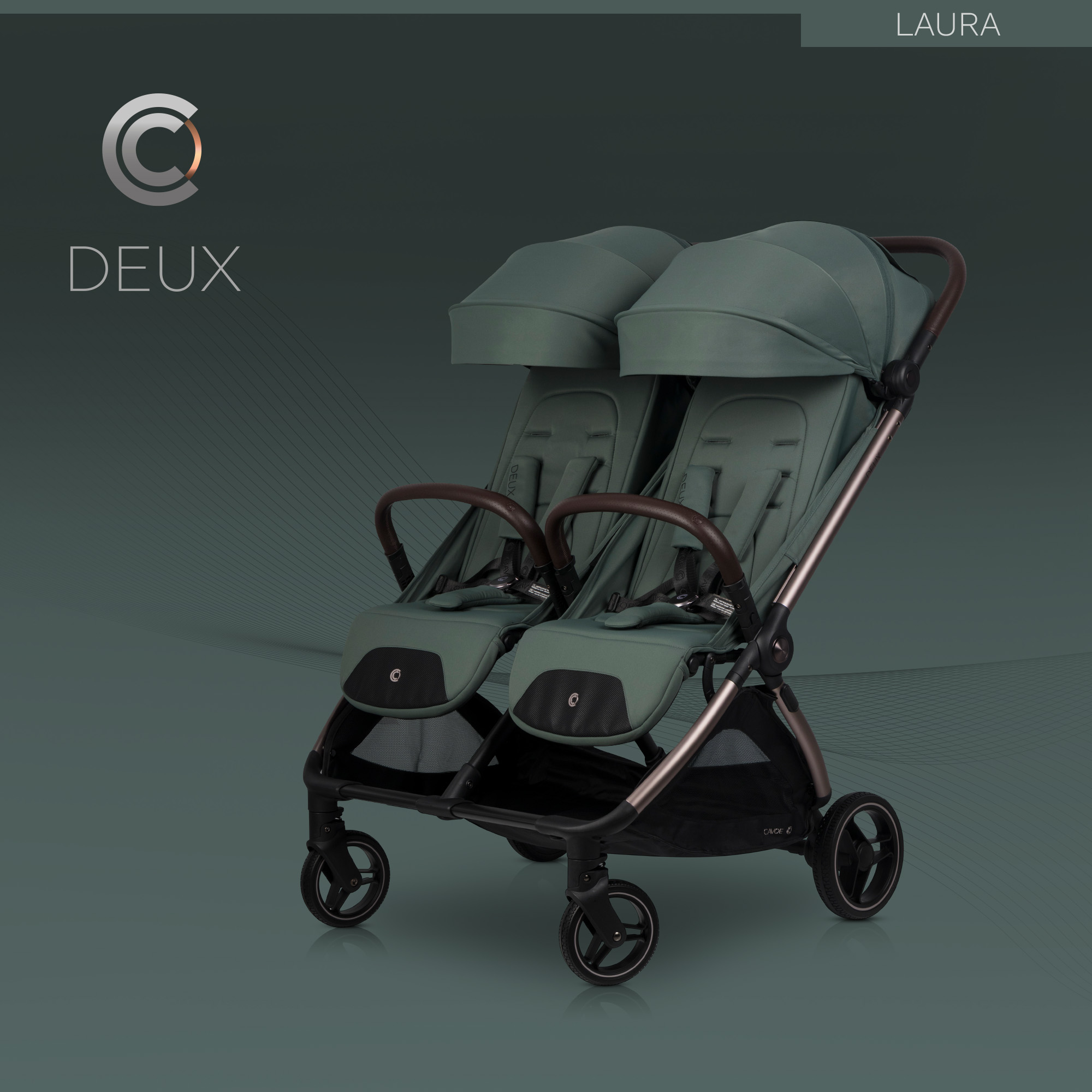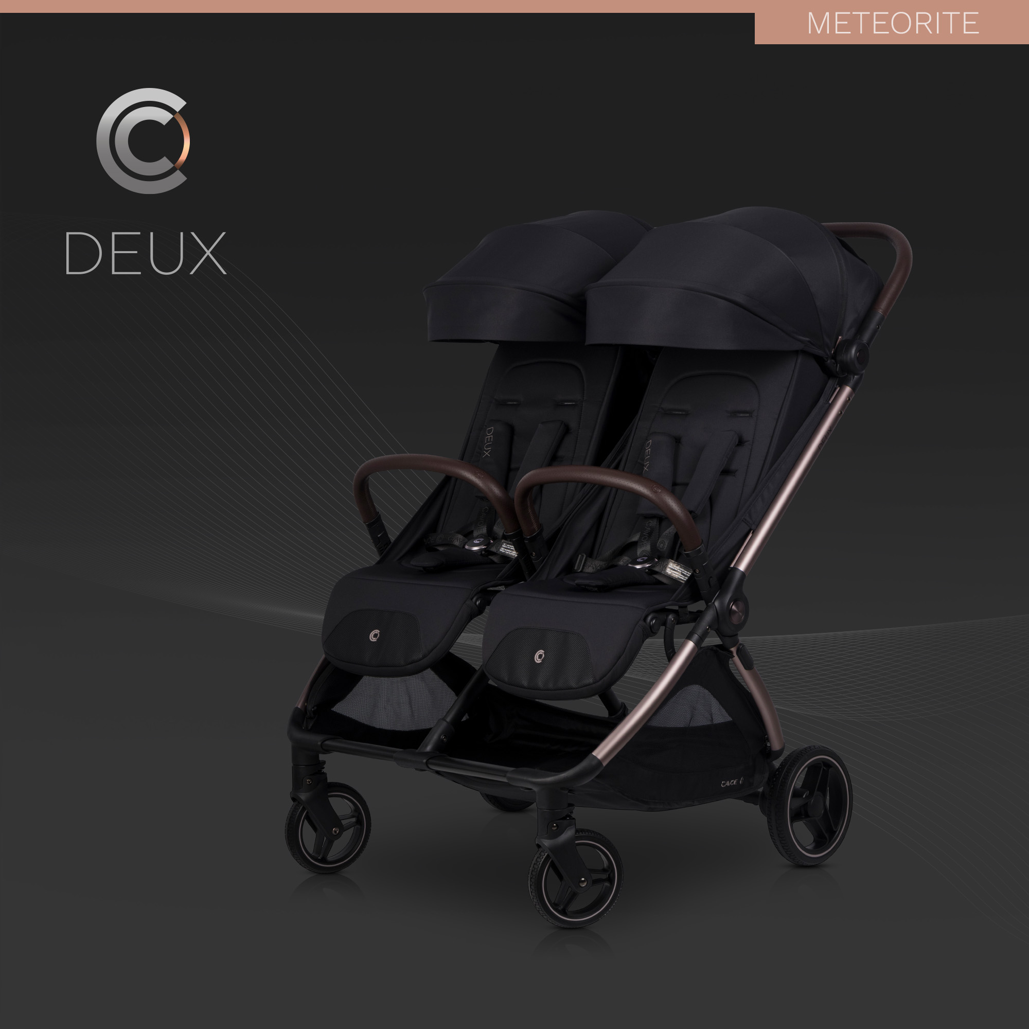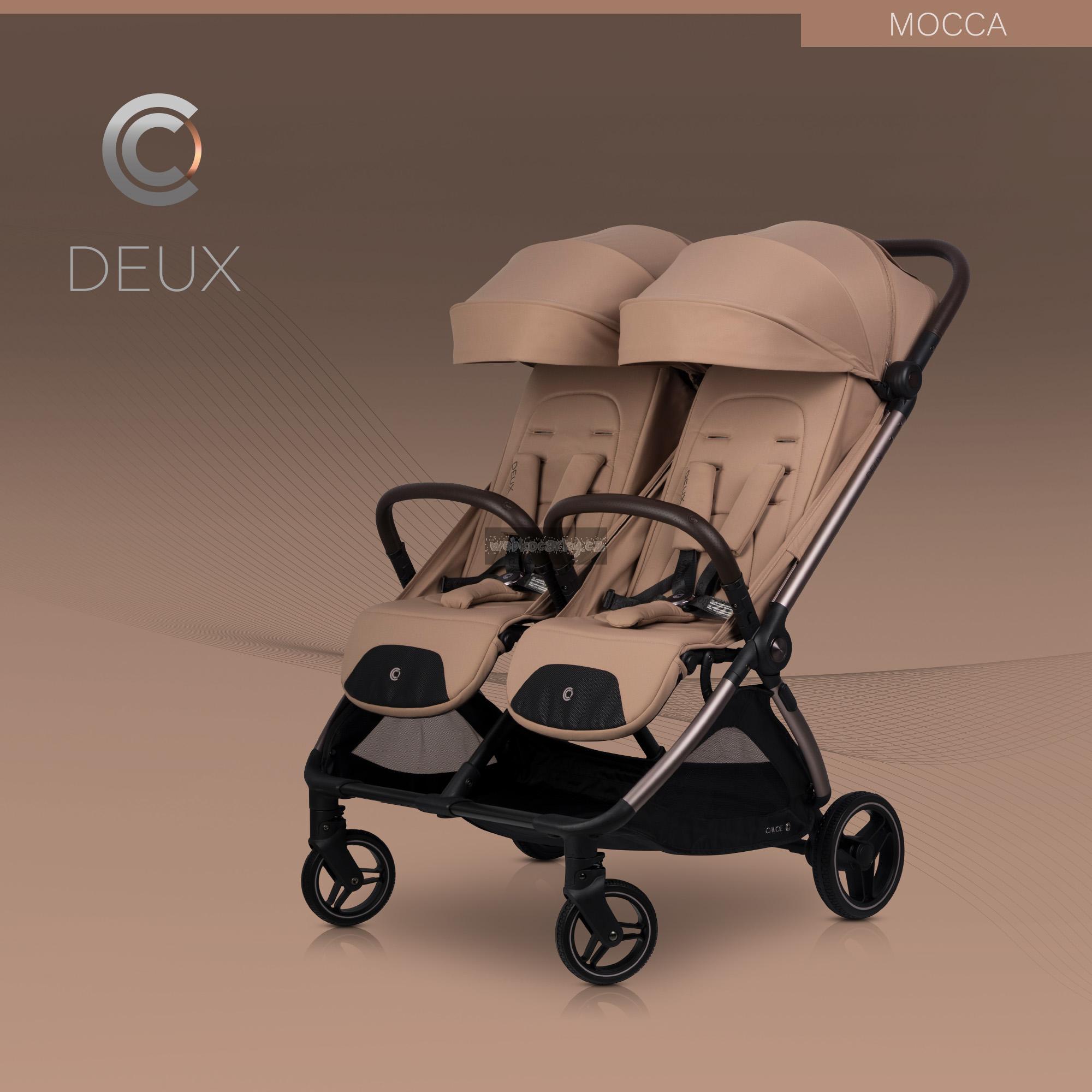 Kočárek CAVOE DEUX pro dvojčata má dvě nezávislá a plně funkční sedadla. Můžete volně nastavit nastavení opatství, podnožek a baldachýnu pro každé sedadlo. Sedadla jsou navržena pro děti od narození do 22 kg (tedy až do přibližně 4 let), takže DEUX bude ideální jako kočárek pro dvě děti různého věku. Každé sedadlo má třístupňové nastavení opěradel, které se skládají z následujících poloh: plně ležecí, pololežecí a plně sedící. Podnožky kočárku DEUX jsou také nastavitelné a co je důležité, jsou plně ohnuté, což umožňuje pohodlný přístup na schod pro větší dítě.