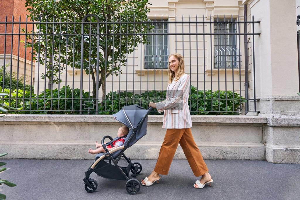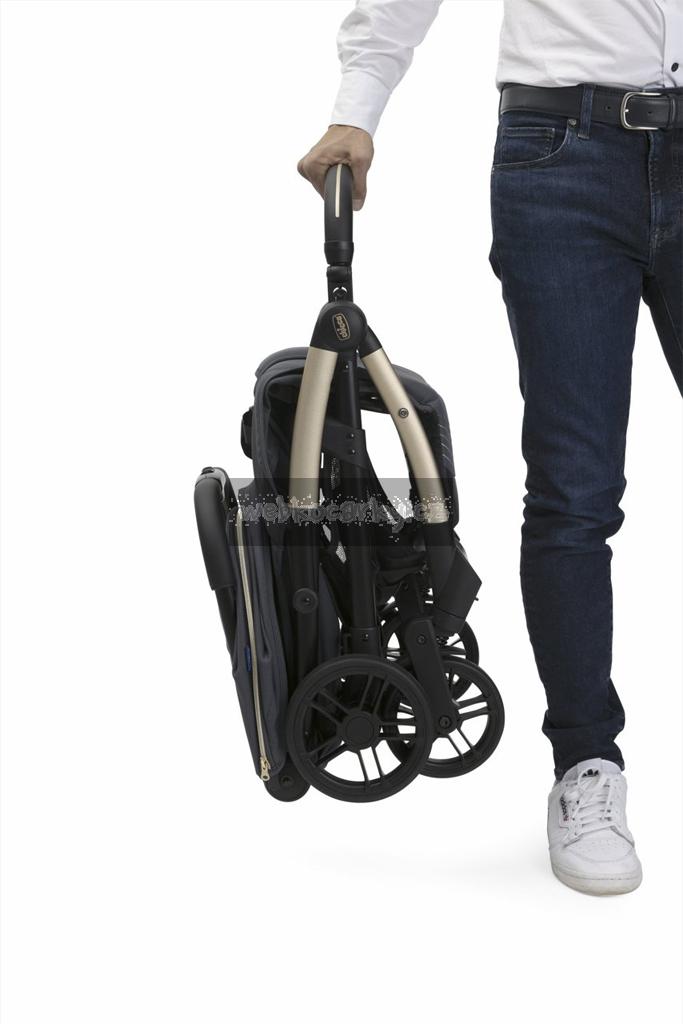 Stačí jeden dotek a kočárek se sám složí! Po složení je opravdu kompaktní a stojí samostatně. Madlo lze také poskládat pro dosažení větší kompaktnosti nebo může být použito jako rukojeť pro přenášení.