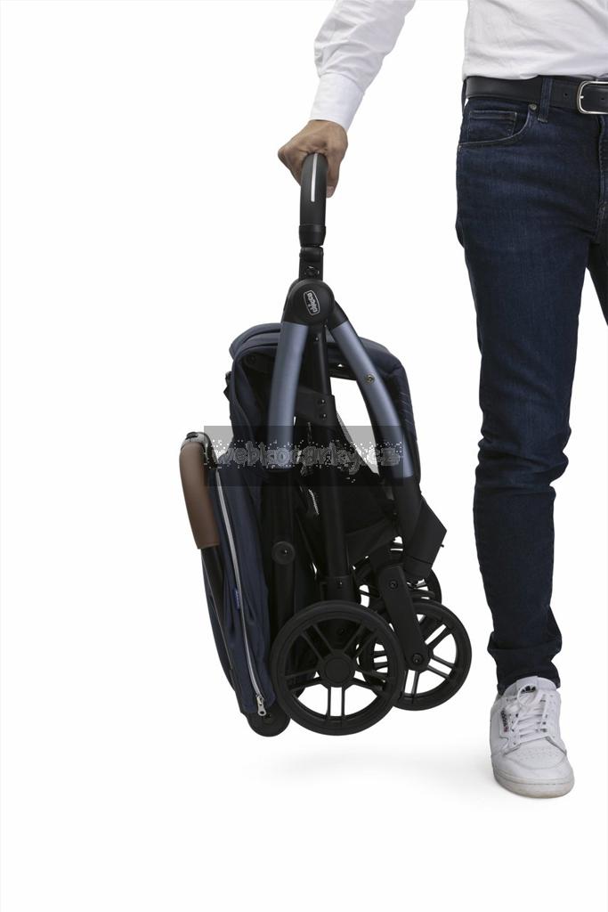 Stačí jeden dotek a kočárek se sám složí! Po složení je opravdu kompaktní a stojí samostatně. Madlo lze také poskládat pro dosažení větší kompaktnosti nebo může být použito jako rukojeť pro přenášení.