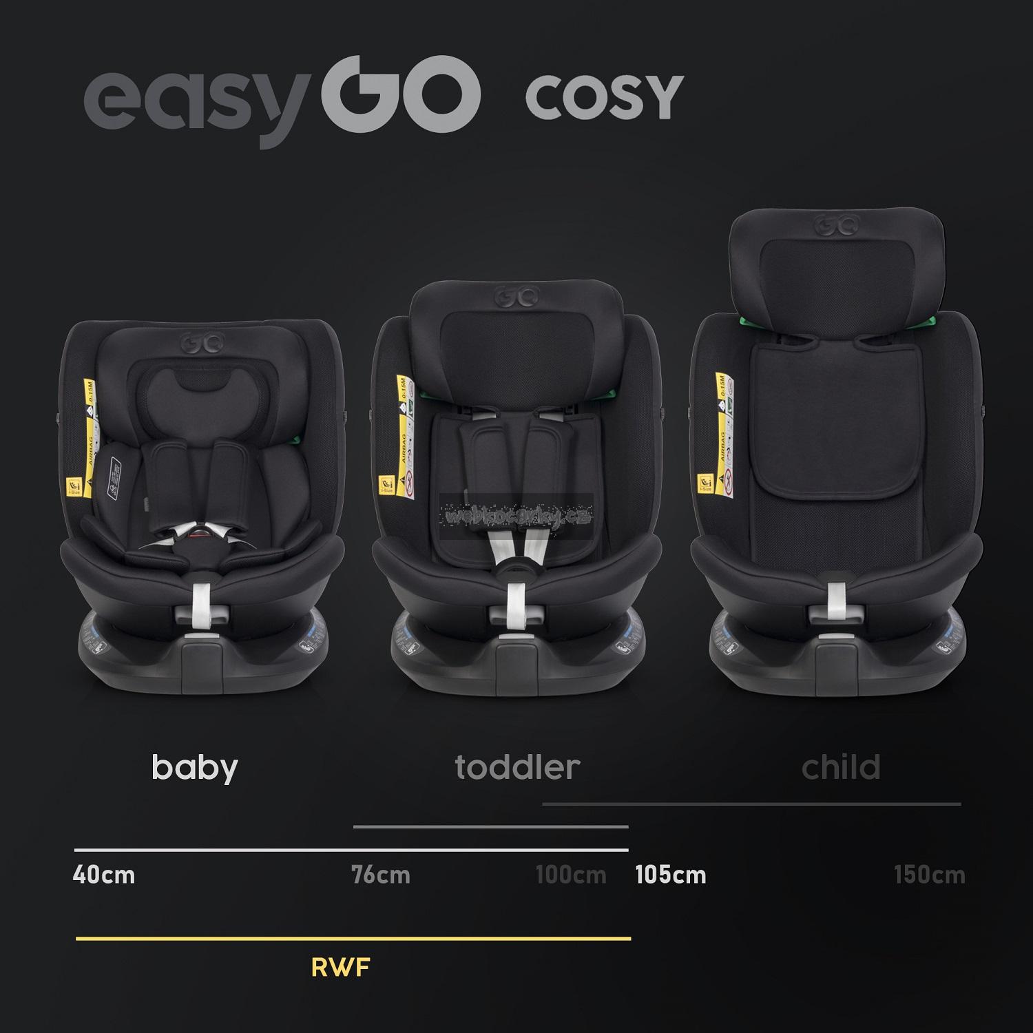 Autosedačka COSY od společnosti EASYGO je určena pro děti od 40 do 150 cm výšky (tj. od narození do přibližně 36 kg). Má integrovanou 360° otočnou základnu ISOFIX a pás TOP TETHER. Mezi další bezpečnostní prvky patří vysoký rám proti otáčení. Díky systému redukčních vložek, širokému rozsahu nastavení výšky a možnosti skrýt pásy roste autosedačka COSY s vaším dítětem a poskytuje tak mimořádně všestranné a cenově výhodné řešení pro vaše dítě. Autosedačka COSY má otočnou základnu ISOFIX, takže usazení dítěte do autosedačky bude rychlé a pohodlné. Jednoduše umístěte autosedačku na bok (proti směru jízdy) a pohodlně posaďte své dítě do autosedačky. Poté otočte autosedačku proti směru jízdy (RWF) a pokračujte v cestě. Polohu proti směru jízdy můžete využít i při stání, například při krmení dítěte. Funkce otáčení funguje hladce a pohodlně se používá. Důležité je, že Top Tether je připevněn k vysokému rámu proti otáčení, nikoli k opěradlu autosedačky, takže neovlivňuje funkci otáčení. Autosedačka EASYGO COSY je kombinací bezpečnosti, pohodlí a bezkonkurenčního stylu a je dalším výrobkem z nejnovější rodiny autosedaček schválených podle normy ECE R129 I-SIZE nové rebrandované značky EASYGO, která prošla v roce 2024 vizuální proměnou. Bezpečnost autosedačky COSY by EASYGO zajišťuje nejnovější evropské schválení ECE R129 I-SIZE, které nahradilo předchozí schválení ECE R44/04, jež nesledovalo vývoj automobilového průmyslu. Od 1. září 2024 se norma ECE R129 stává jedinou platnou normou pro schvalování autosedaček v Evropské unii. Klíčem k zajištění bezpečnosti je přizpůsobení autosedačky dítěti i vozidlu a její správná montáž. Ani ta nejúčinnější autosedačka nezajistí maximální bezpečnost, pokud tato dvě kritéria nejsou splněna. Cílem normy ECE R129 I-SIZE je snížit rizika spojená s nesprávným výběrem a instalací autosedaček. Subjektivní kritérium hmotnosti dítěte bylo nahrazeno objektivnějším kritériem výšky. Kromě toho musí být všechny autosedačky certifikované podle normy ECE 129 I-SIZE instalovány pomocí systému ISOFIX, který výrazně snižuje počet chyb při instalaci. Autosedačku EASYGO COSY lze umístit proti směru jízdy pro děti do výšky 105 cm (RWF do hmotnosti přibližně 18 kg). Testy prokázaly, že se jedná o nejbezpečnější možný způsob umístění autosedačky v automobilu. Někdy se však stává, že dítě při jízdě proti směru jízdy trpí nevolností z pohybu. Autosedačku COSY lze používat v poloze proti směru jízdy pro děti od výšky 75 cm. Sedačka COSY má až 8 poloh naklápění: 4 v poloze po směru jízdy a 4 v poloze proti směru jízdy. To znamená, že můžete vždy nastavit sklon sedačky tak, aby vyhovoval sklonu autosedačky a usnadnil dítěti usínání na delších cestách. Čalounění autosedačky je stejně důležité jako její konstrukce. Je nedílnou součástí ovlivňující bezpečnost a pohodlí vašeho dítěte během cesty. Otočná autosedačka EASYGO COSY má systém redukčních vložek a čalounění z nejkvalitnějších látek. Vnější prvky sedačky (ty, které jsou v přímém kontaktu s rukama a nohama dítěte, a redukční vložky) jsou vyrobeny z měkké pleteniny v módních a praktických melanžových barvách. Vnitřní část sedačky je vyrobena z odvětrávané 3D voštinové tkaniny, která dokonale odvádí vlhkost a udržuje dítě v pohodlí i na dlouhých cestách. Další funkcí autosedačky COSY je sluneční clona určená pro děti do výšky 87 cm. Sluneční stříška může být praktická zejména při přepravě dítěte v poloze proti směru jízdy, kdy slunce svítí zadním oknem. Stříšku lze kdykoli složit nebo zcela odejmout bez použití jakéhokoli nářadí. Autosedačka má 10stupňové nastavení výšky opěrky hlavy integrované do výškového nastavení ramenních popruhů bezpečnostních pásů. Co to znamená? Jednoduše nastavte výšku opěrky hlavy podle výšky vašeho dítěte a pásy se automaticky nastaví do správné výšky. Nezapomeňte, že v případě kolize nebo dopravní nehody hraje správné nastavení bezpečnostních pásů klíčovou roli. Další funkcí autosedačky COSY je sluneční stříška určená pro děti do výšky 87 cm. Stříška může být praktická zejména při přepravě dítěte v poloze proti směru jízdy, kdy slunce svítí zadním oknem. Stříšku lze kdykoli složit nebo zcela odejmout bez použití jakéhokoli nářadí. Autosedačka má 10stupňové nastavení výšky opěrky hlavy integrované do výškového nastavení ramenních popruhů bezpečnostních pásů. Co to znamená? Jednoduše nastavte výšku opěrky hlavy podle výšky vašeho dítěte a pásy se automaticky nastaví na správnou výšku. Nezapomeňte, že v případě kolize nebo dopravní nehody hraje správné nastavení bezpečnostních pásů klíčovou roli. Hlavní výhody autosedačky EASYGO COSY ROTATING ISOFIX BASE - díky integrované otočné základně ISOFIX můžete dítě do autosedačky rychle a pohodlně usadit. Základna umožňuje polohovat autosedačku do strany, když dítě usazujete, a také když stojíte (například při krmení dítěte, zatímco rodič sedí vedle vás). SCHVÁLENÍ ECE R129 I-SIZE - jedná se o jediné schválení povolené v Evropské unii. Je také považováno za nejobjektivnější. Některé známé komerční instituty (např. ADAC) provádějí vlastní klasifikaci hodnocení autosedaček. Nezapomeňte však, že hodnocení bezpečnosti tvoří pouze 50 % celkového hodnocení. I autosedačky s nejvyšším hodnocením v testech ADAC musí mít schválení R129, aby mohly být prodávány v Evropské unii. AUTOSEDAČKA RŮSTE S VAŠÍM DÍTĚTEM - Autosedačka CO