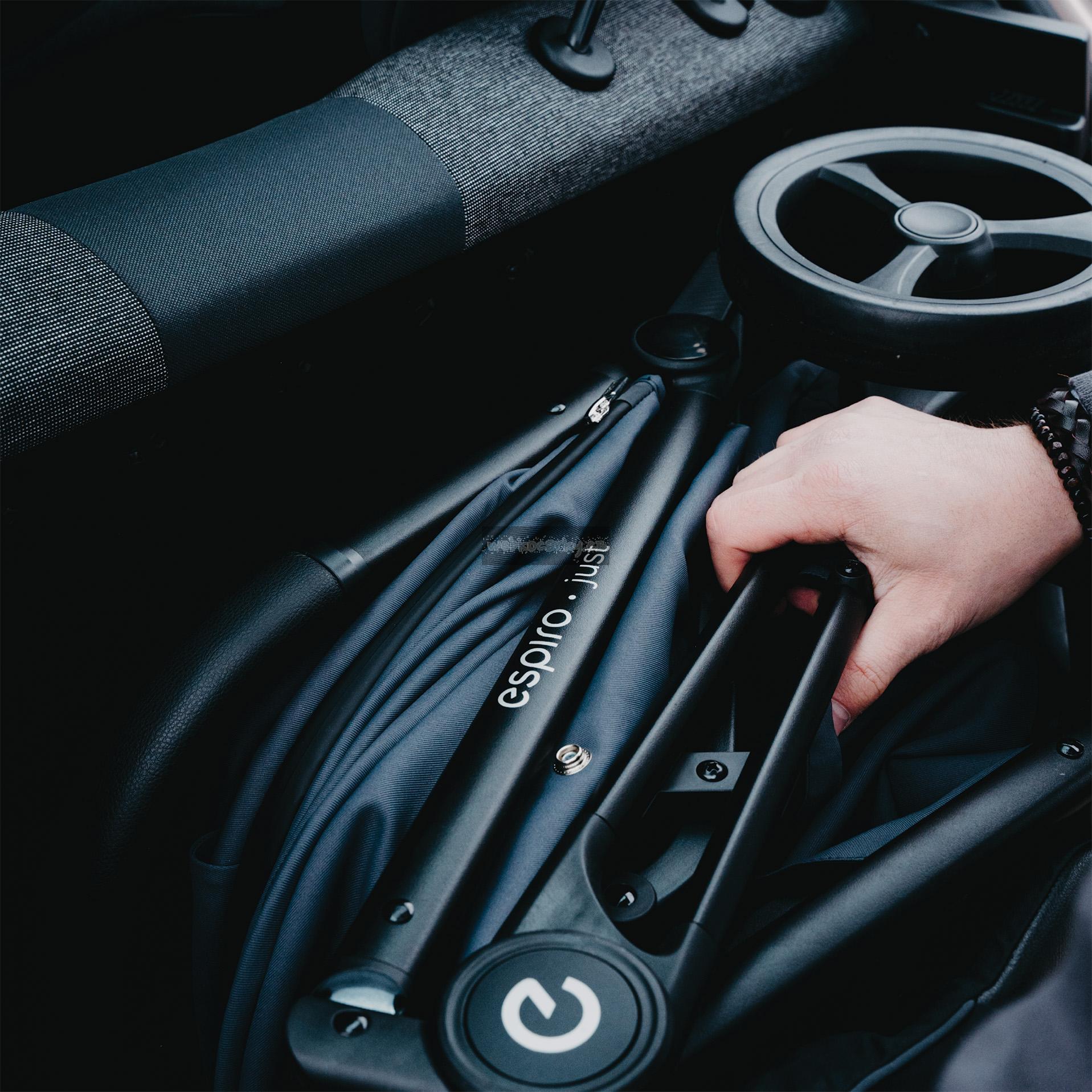 Kočárek espiro just má automatický systém skládání - autofolding, který vám umožní kočárek složit jedním pohybem. Je lehký, což vám usnadní přenášení a zvedání. Jeho kompaktní tvar vám umožní uložit jej prakticky kdekoli. I přes jeho lehkost a malé rozměry jsme do něj ale vměstnali vše, co potřebujete: plnohodnotnou pohodlnou sedačku, pětibodové bezpečnostní pásy, velká kola i praktický nákupní košík.