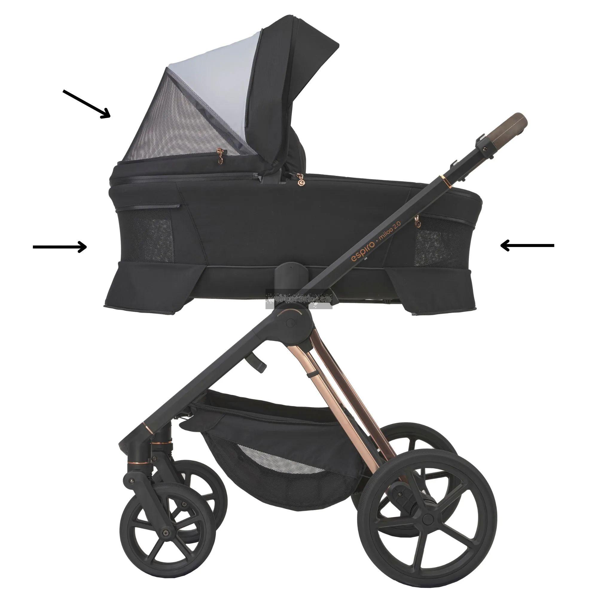 Pohodlná hluboká korba poskytuje ideální podmínky pro novorozence i mladší kojence. Je vybavena dodatečným stabilizátorem vibrací, díky kterému dítě vnímá otřesy při jízdě po nerovném povrchu, chodnících či parkových cestách jen minimálně. Korba kočárku Espiro Miloo 2.0 je navíc opatřena čtyřnásobným ventilačním systémem, který zajišťuje lepší přístup čerstvého vzduchu a přispívá k maximálnímu komfortu a pohodě dítěte.
