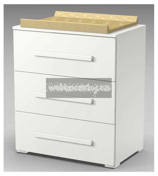 Velikost: 81 x 52 x 94 cm (šířka/hloubka/výška) - Materiál: laminovaná dřevotříska - Ošetřeno materiálem s povrchovou úpravou, který je vhodný pro děti, při kontaktu se slinami se nerozpouštějí žádné škodlivé látky. - Praktické uspořádání zásuvky s dřevěnými úchytkami. Dá se využít i jako obyčejná komoda v dětském pokoji po plenkovém období. - Neobsahuje přebalovací nástavec (dokupuje se zvlášť), na přebalování se můžete postavit k boku skříňky. - Přebalovací plocha: 80 x 50 cm.