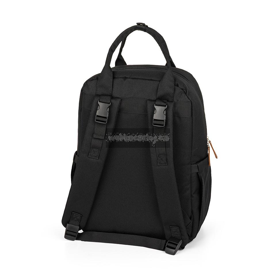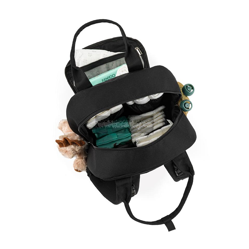 Batoh obsahuje 2 hlavní přihrádky, 2 termální kapsy, navíc 2 boční kapsy na láhev a ubrousky a speciální kapsu na multifunkční přebalovací podložku, do které se vejde tablet nebo notebook (až do 15,6”). Díky několika kapsám s hladkým zipem máte k obsahu tohoto batohu snadný přístup pouhou jednou rukou.