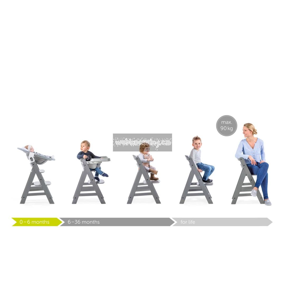 Roste s Vámi celý život // Židlička ALPHA+ je vhodná od cca. 6 měsíců a díky nastavitelnému sedadlu a opěrce nohou roste spolu s dítětem po celý život. Je robustní, její nosnost činí až 90 kg a konstrukčně poskytne maximální stabilitu. Převrhnutí se rozhodně bát nemusíte.