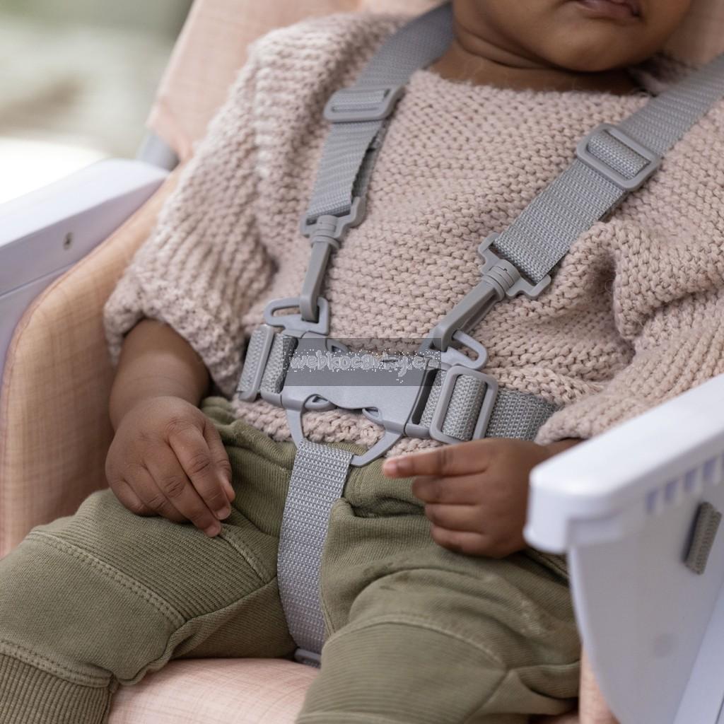 Je to jediná vysoká židle, která nabízí talíř pro podporu schopností děťátka při samokrmení. Jedinečný 3-dílný talíř Twist & Dine se bezpečně uzamkne na svém místě, aby jej malé děti nehodily na zem, a je vhodný do mikrovlnné trouby pro snadnou přípravu jídla. Jak dítě roste, velký pultík se nastavuje do 3 poloh. Pultík se při skladování připevňuje k opěradlu židle. Sedací podložka je omyvatelná v pračce. 5-bodové bezpečnostní pásy zajišťují bezpečnost dítěte.