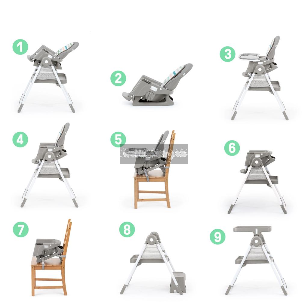 - 9 režimů pro jedno dítě: plně sklopné křesílko, odnímatelné houpací křeslo, vysoká židle, židle ke stolu, přenosná židle na běžnou židli, židle pro batole, podsedák, učící/kuchyňská věž, kreativní stolek se židlí