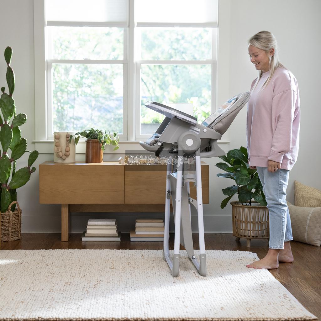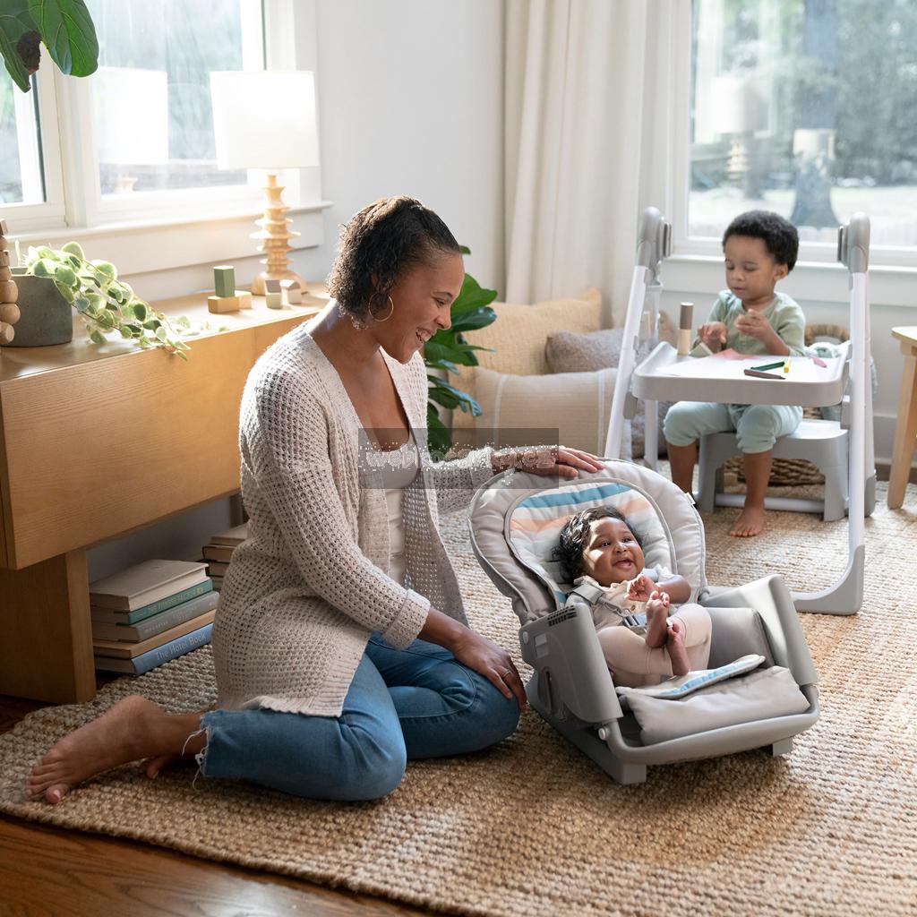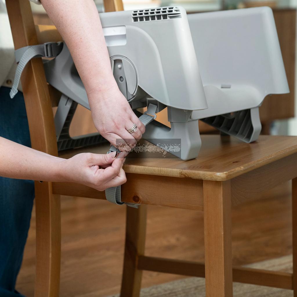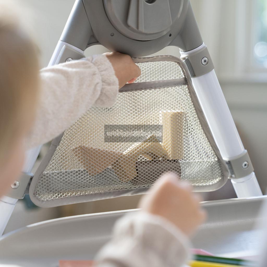 Narodilo se vám druhé dítě? Tato židle dokáže posloužit dvěma dětem najednou v 6 různých kombinacích v režimech houpací křeslo, stolek, věž a nástavba na židli. Pro nejmenší zaručuje ergonomický design 90-90-90 správné držení těla – kotníky, kolena a bedra v pravém úhlu pro lepší trávení během jídla. Pětibodový bezpečnostní pás udrží dítě v bezpečí. Jak dítě roste, stále oceníte funkce jako 3-polohový pultík s vložkou vhodnou do myčky na nádobí a odkládací prostor pod sedadlem. Když se z děťátka stane batole, oblíbené hračky a potřeby na tvoření si může uložit do praktických úložných kapes na boční straně stolku. Součástí je i odnímatelná lavice jako další možnost sezení.