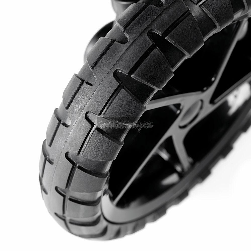 - 4 velká PU kola - odolná proti průrazu, přední otočná s aretací.