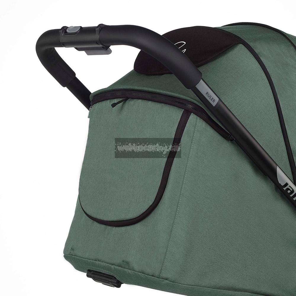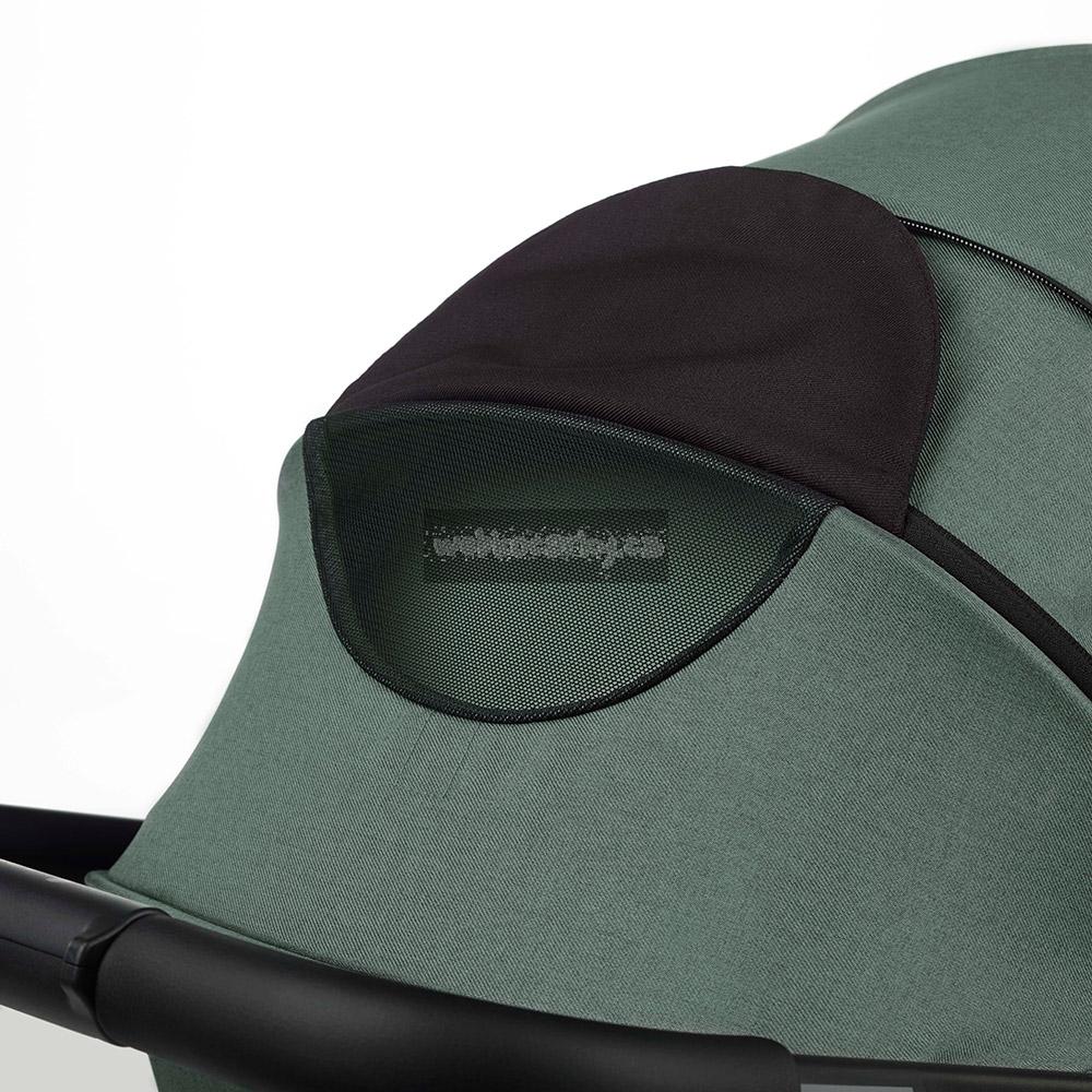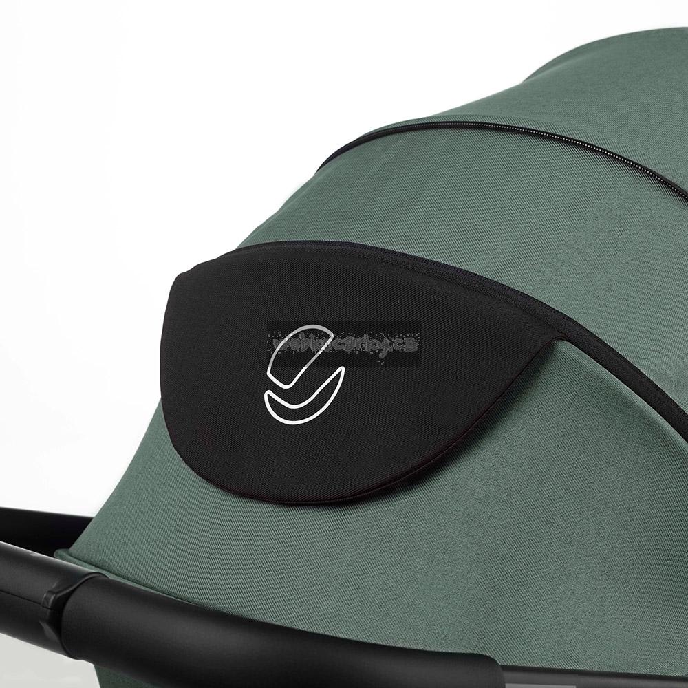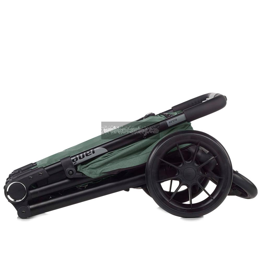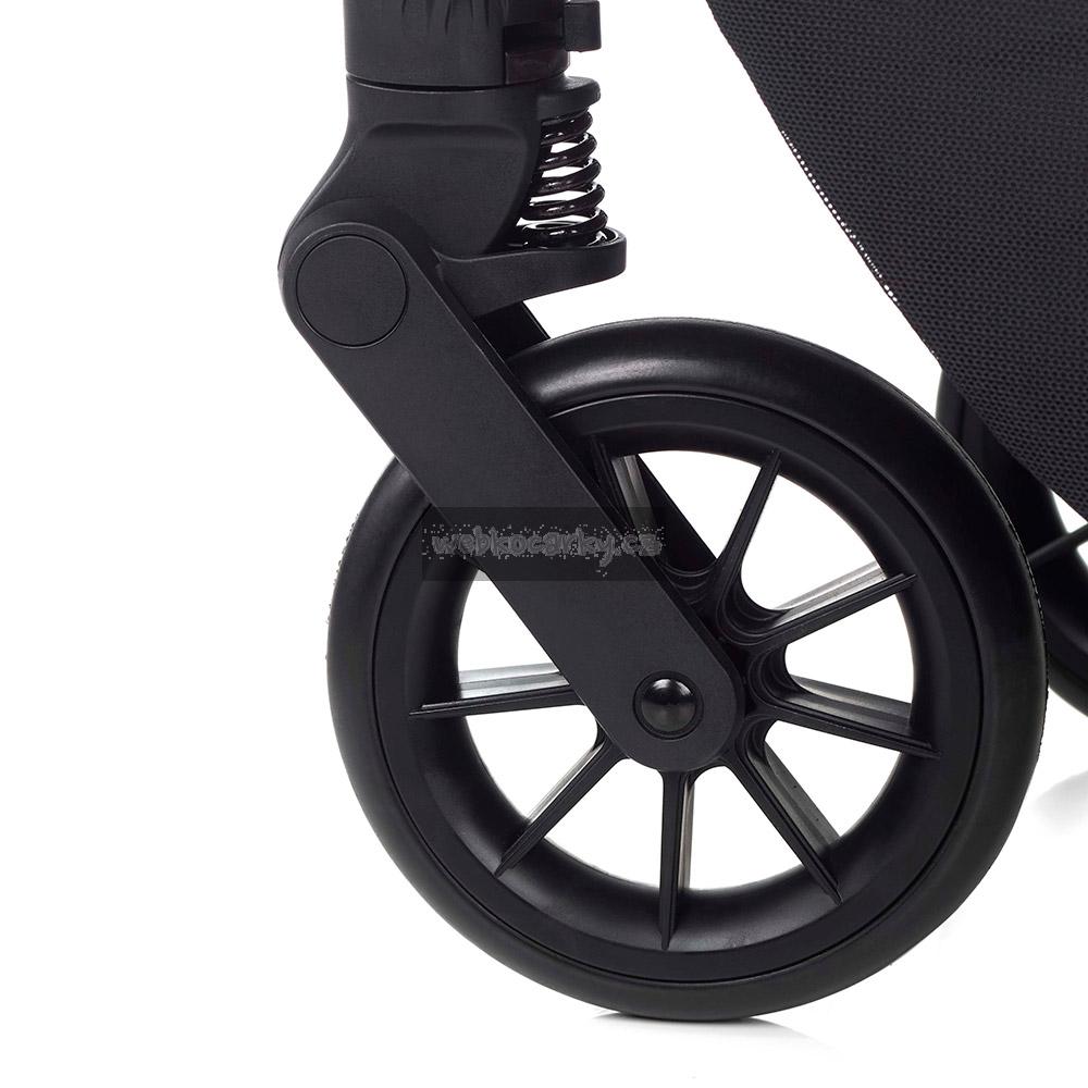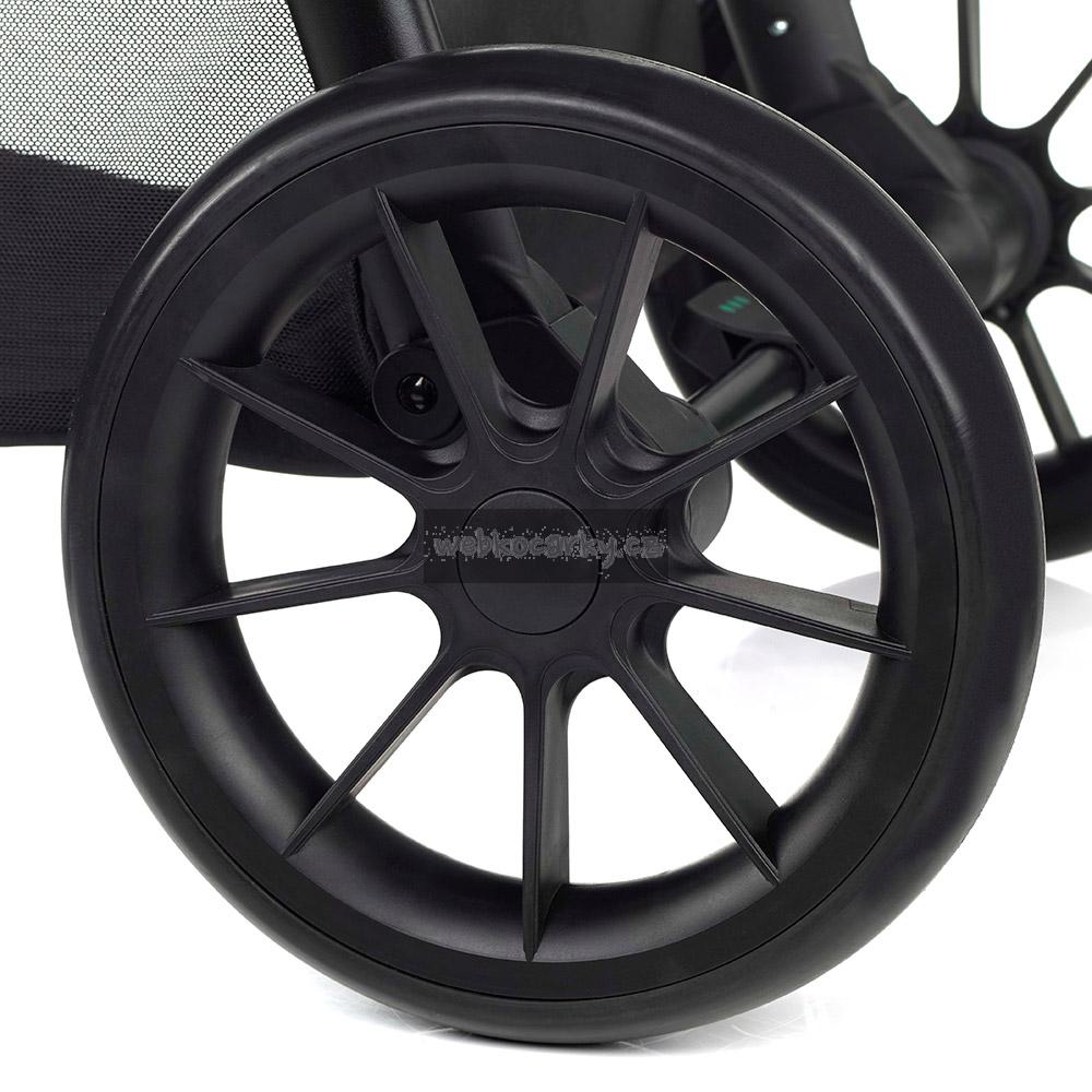 Jednoduchý, kompaktní skládací systém s pojistkou, která zabraňuje náhodnému rozložení kočárku. Synchronizovaná nožní brzda. Materiál, ze kterého je kočárek vyroben je premium kvalita. Materiál je vodě a větru odolný, neprofoukavý, zároveň prodyšný, UV faktor 50+. Konstrukci lze poskládat i se sportovní částí. Možnost fixování předních koleček.