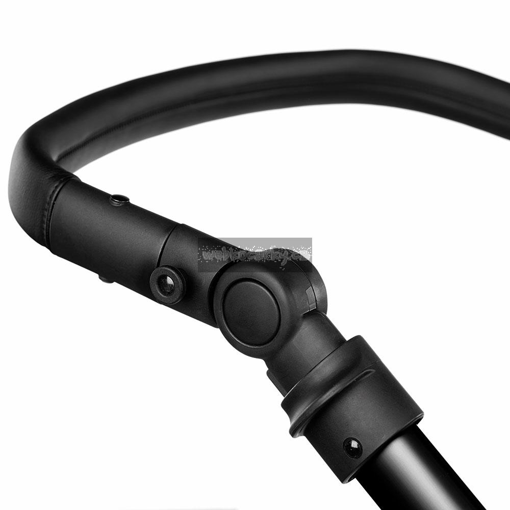 Kočárek má výškově nastavitelnou rukojeť s ruční parkovací brzdou.