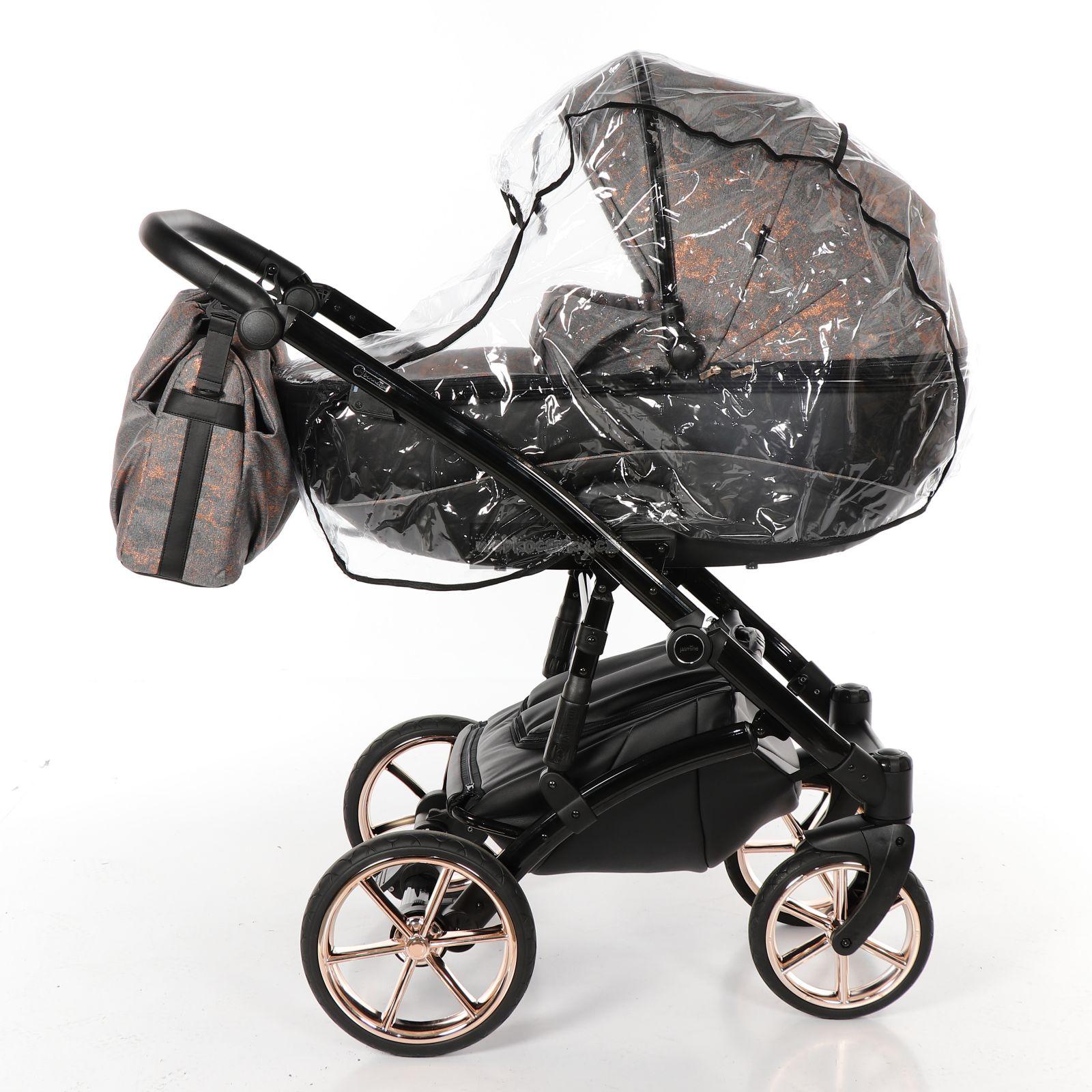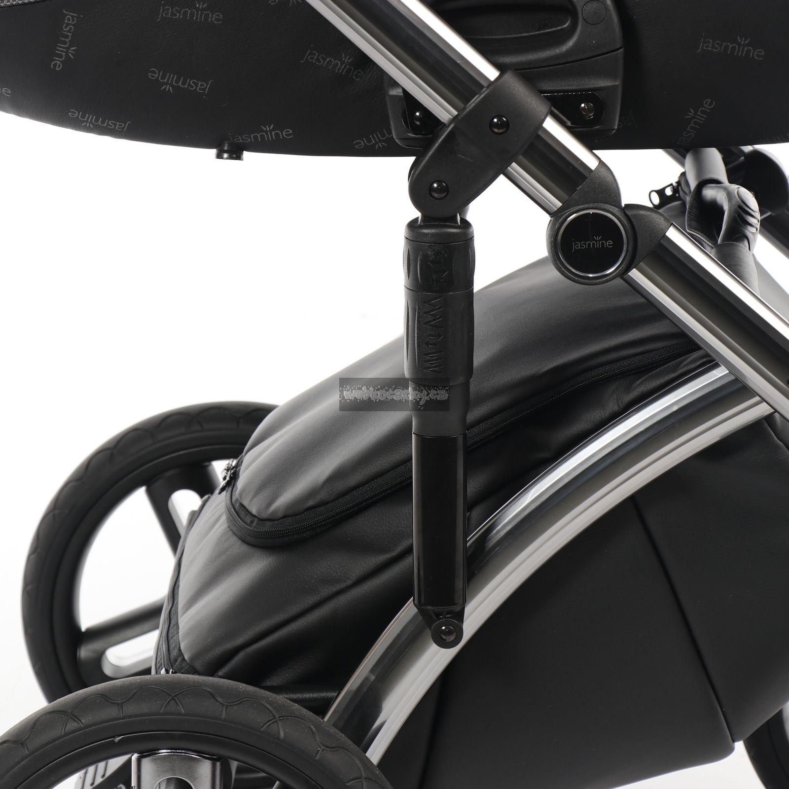 Hluboká korbička je dostatečně prostorná a dlouhá. Potah vaničky z EKO kůže má jemný ornament s logem Jasmine. Bouda kočárku je šitá z nových atraktivních a kvalitních látek doplněných designovými lištami v barvě konstrukce. Taška na kočárek má designový střih s magnetickým uzavíráním a praktickým organizérem, uvnitř doplněným přebalovací podložkou. Koženkový košík pod kočárkem je velmi prostorný a praktický - špína a prach se z něj jednoduše setře.