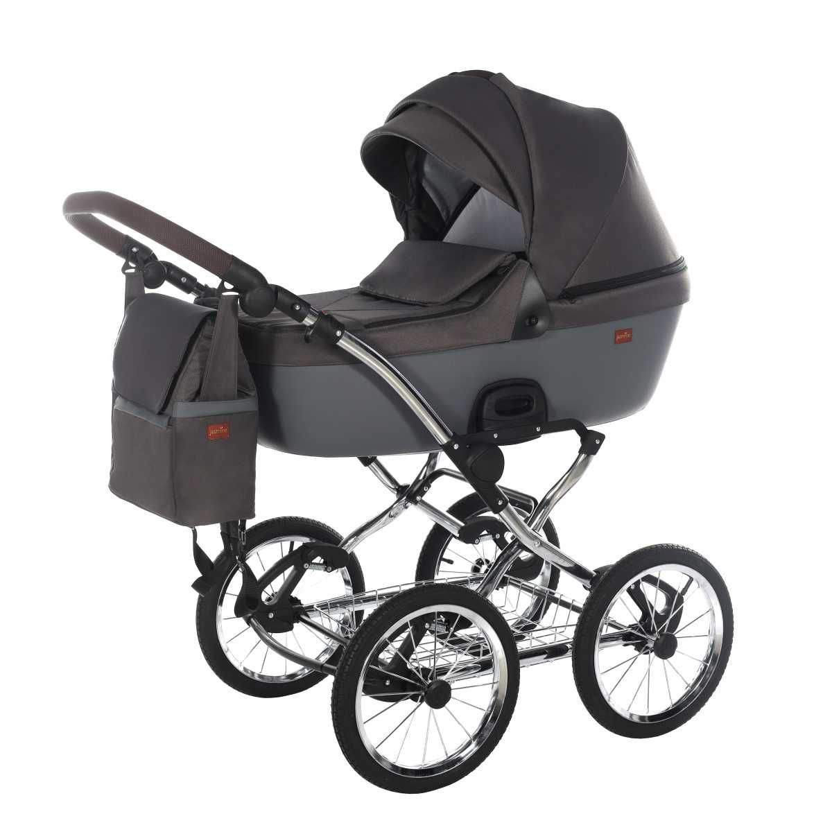 Kočárek s velkou korbou - jednou z největších na našem trhu má potah z EKO kůže, na které je jemná, minimalistická dekorace v podobě loga Jasmine. Boudička kočárku je šitá z nových, atraktivních a kvalitních látek doplněných designovými lištami - provedení tmavý chrom.