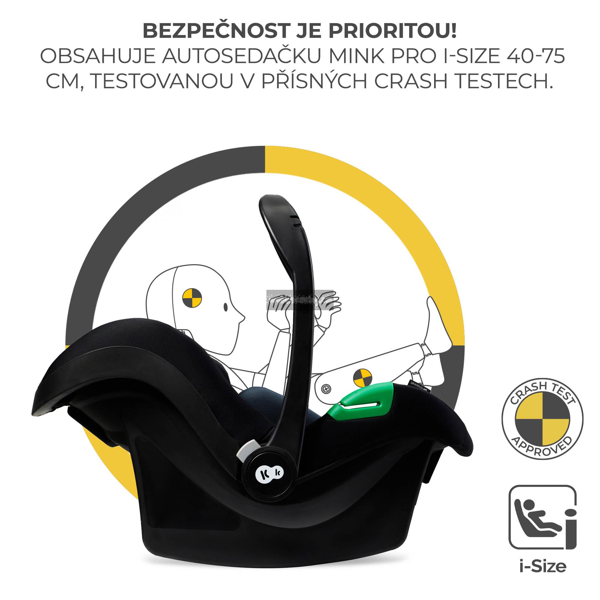 Součástí balení je autosedačka MINK PRO 2 i-Size (40–87 cm) s adaptéry, které umožňují vytvořit cestovní systém (TRAVEL SYSTEM). Kromě toho získáte držák na sklenici, univerzální nánožník, pláštěnku a tašku na rukojeť.