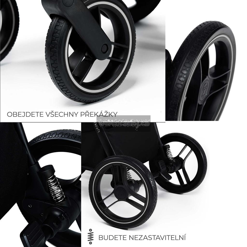 - Velká kola s tlumiči nárazů umožňují snadné zvednutí kočárku a nevyžadují pumpování.