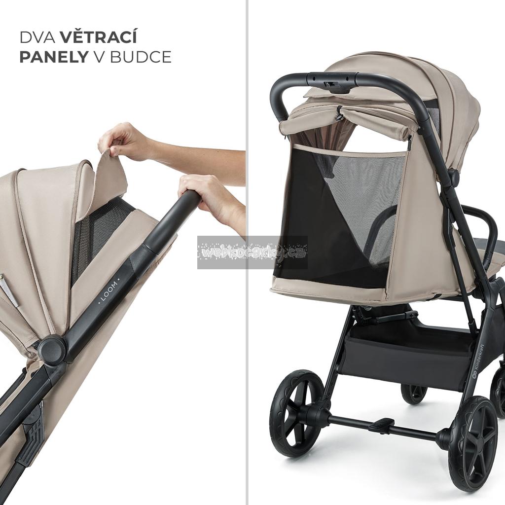 Kočárek LOOM má ventilační panel na zadní straně, který lze otevřít, když je opěradlo nastaveno dolehu. Kromě toho vhodnou ventilaci zajišťuje i okénko umístěné na stříšce.