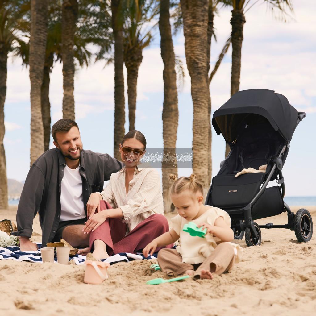 Kočárek se prodává se zatahovací síťkou proti hmyzu, kterou lze schovat do opěrky nohou a praktickým držákem na sklenici. Stává se tak ideálním řešením pro aktivní rodiny, které při společných výletech oceňují pohodlí, bezpečnost a styl.