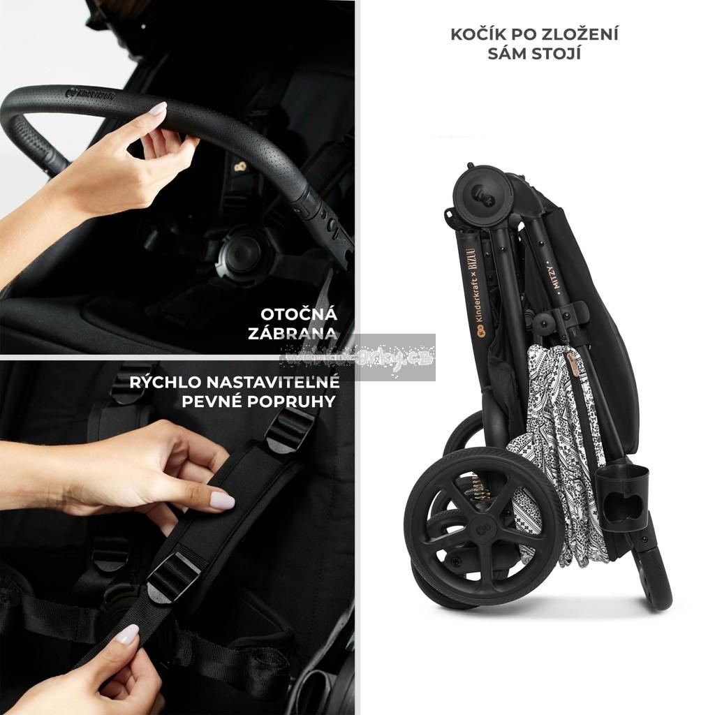 Vkládání dítěte do kočárku nebylo nikdy tak jednoduché. Otočnou zábrana lze jednoduše sklopit a polstrované 5-bodové bezpečnostní pásy umožňují rychlé připoutání dítěte. Popruhy můžete nastavit v okamžiku pomocí jedné ruky. MITZY má také velký koš s nosností až 5 kg, do kterého můžete uložit dětské hračky a větší nákupy.