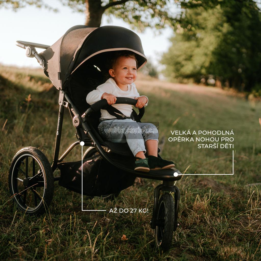 HELSI 2 se stará také o pohodlí vašeho dítěte – opěrku zad můžete snadno nastavit až do polohy vleže. Nastavení tak, jak si to vaše dítě přeje, zabere jen chvilku. Miluje vaše dítě spánek během procházek? Žádný problém, nastavte širokou opěrku zad do polohy vleže. Nebo se raději kochá výhledem na stezku? Nastavte ji tak, aby se vaše dítě mohlo během procházky pohodlně opřít. Kočárek HELSI 2 je vybaven velkou a pohodlnou opěrkou nohou - ideální pro větší a starší děti.