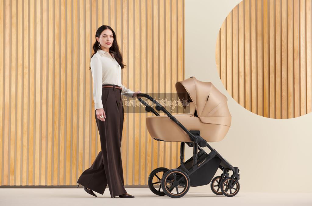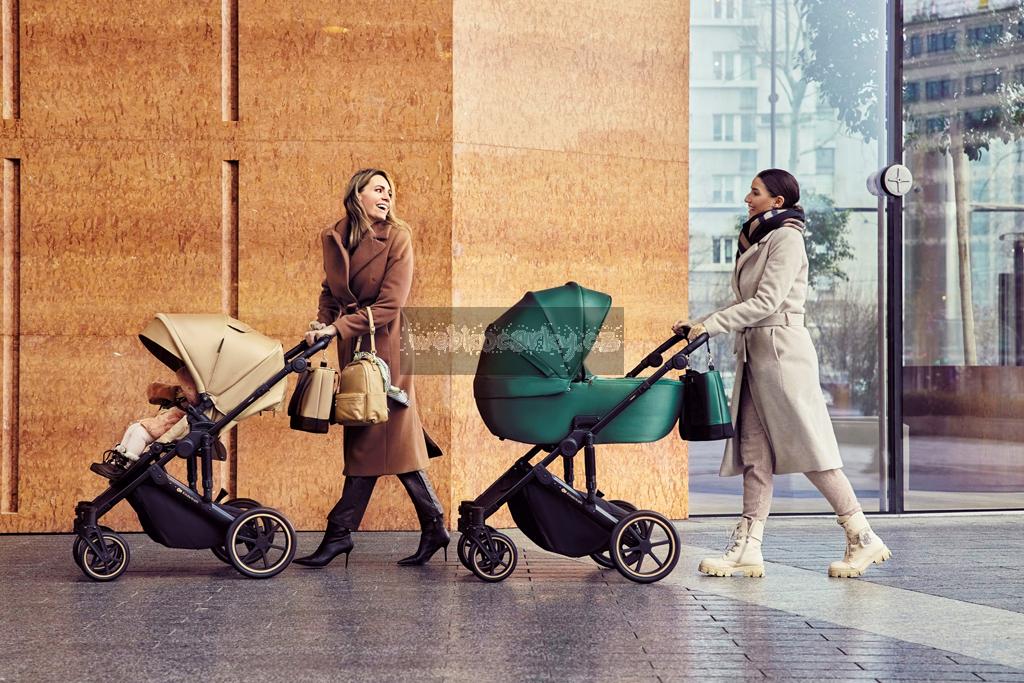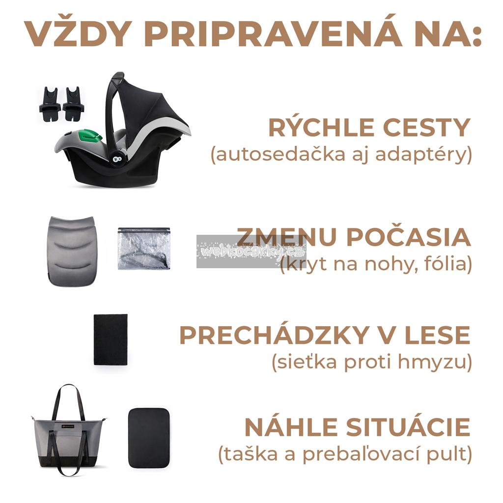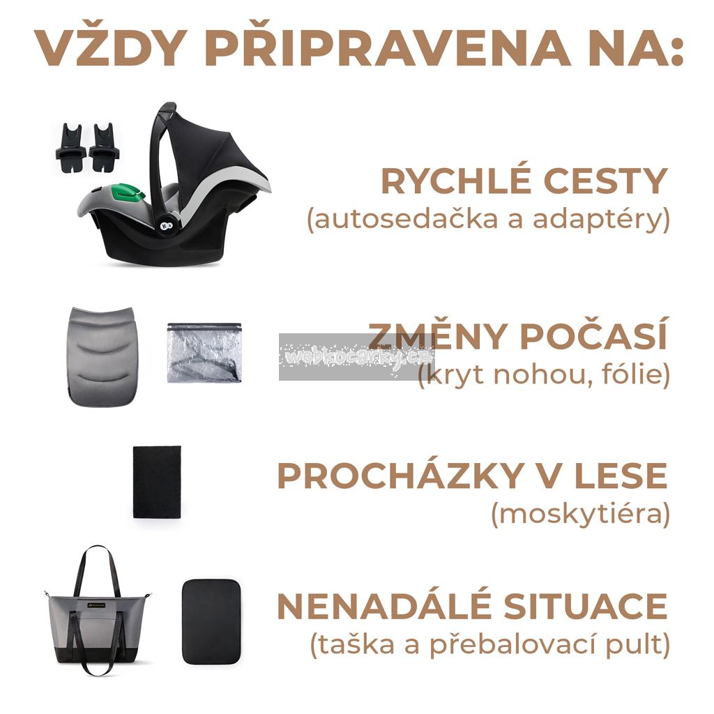 Kočárek se dodává s praktickým příslušenstvím: elegantní taška s cestovní přebalovací podložkou, pláštěnka proti dešti, síťka proti hmyzu, dětská autosedačka s adaptéry, matrace do vaničky, nánožník (pro sportovní kočárek i pro vaničku).