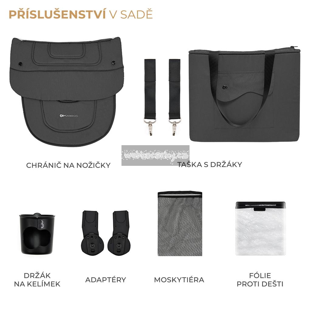 Objemný koš s nosností až 5 kg pojme veškeré potřebné příslušenství. Deka a pleny navíc? A co nákupy, které jste udělali po cestě domů? Snadný přístup z obou stran vám umožní rychle vytáhnout jakoukoli věc. Ke kočárku je dodáváno také příslušenství: moskytiéra (v opěrce nohou, kterou budete mít vždy s sebou), chrániče na nohy, pláštěnka, držák na nápoje, taška na rukojeť pro rodiče a adaptéry na autosedačku.