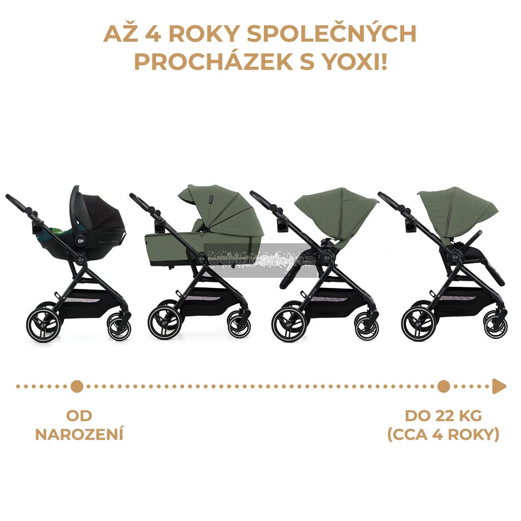 Kočárek YOXI 3 v 1 byl vytvořen pro děti od narození do přibližně 4 let (22 kg). Velká pohodlná korba s měkkou matrací byla navržena speciálně pro miminka, a když dítě vyroste, můžete ji jednoduše vyměnit za sportovní sedačku, kterou lze používat ve směru nebo proti směru jízdy.