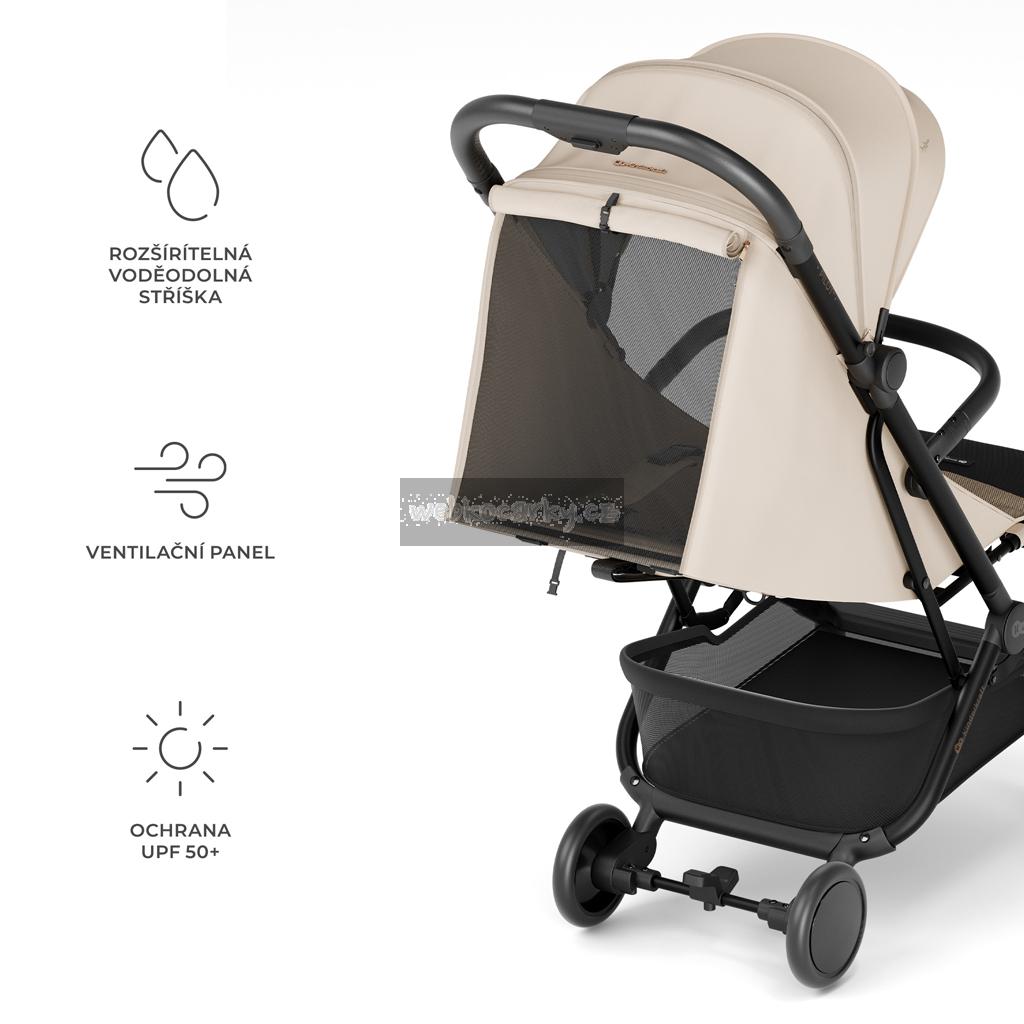 Nepromokavá stříška vyrobená z materiálu UPF 50+ účinně chrání vaše dítě před sluncem a deštěm. Dá se prodloužit a poskytnout tak ještě větší ochranu při měnících se povětrnostních podmínkách. Dodatečný ventilační panel zlepšuje cirkulaci vzduchu a umožňuje sledování vašeho dítěte.