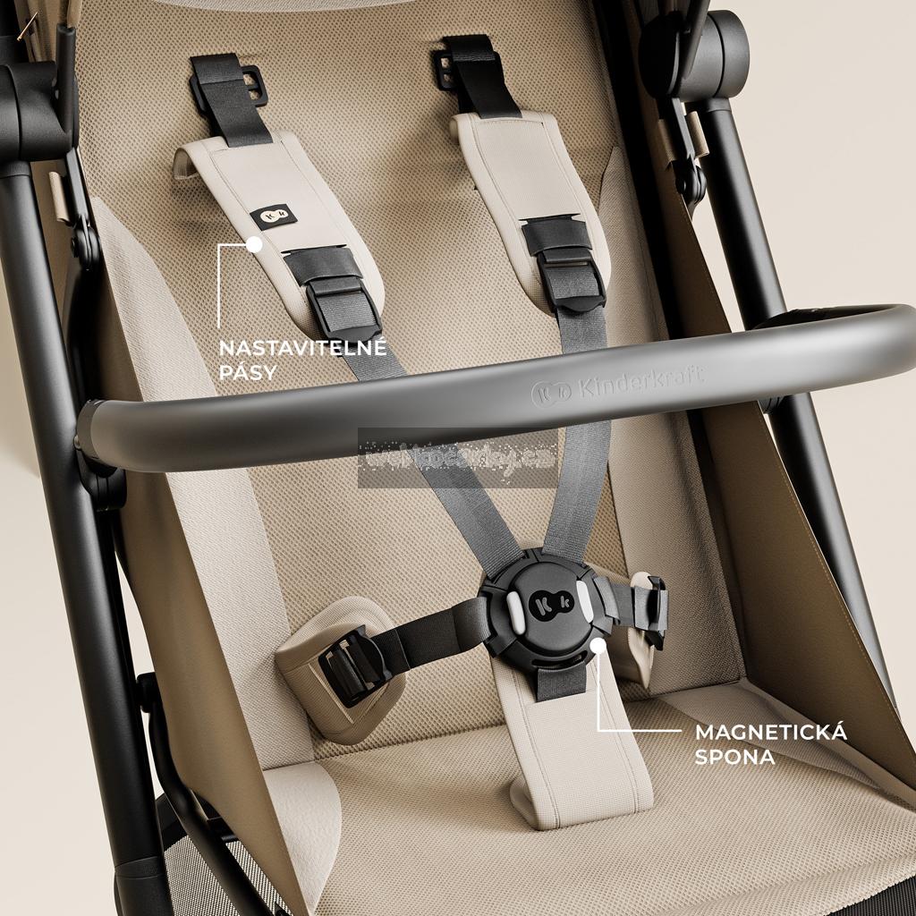 Magnetické, pětibodové bezpečnostní pásy zaručují bezpečnost a snadné používání - zapnutí a odepnutí trvá jen chvíli. Bezpečnostní pás je také vybaven pohodlným výškovým nastavením, které vám umožní přizpůsobit jej výšce dítěte nebo tloušťce oblečení, aniž byste jej museli znovu zapínat. Otočné madlo, které lze z obou stran odebrat, navíc usnadňuje nakládání a vyjímání dítěte z kočárku a poskytuje rodičům maximální komfort.