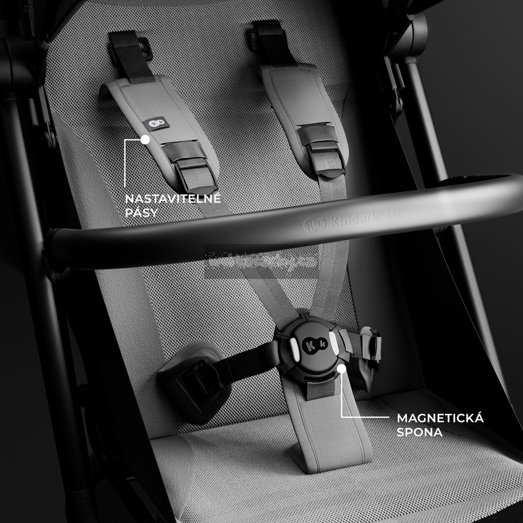 Magnetické, pětibodové bezpečnostní pásy zaručují bezpečnost a snadné používání - zapnutí a odepnutí trvá jen chvíli. Bezpečnostní pás je také vybaven pohodlným výškovým nastavením, které vám umožní přizpůsobit jej výšce dítěte nebo tloušťce oblečení, aniž byste jej museli znovu zapínat. Otočné madlo, které lze z obou stran odebrat, navíc usnadňuje nakládání a vyjímání dítěte z kočárku a poskytuje rodičům maximální komfort.