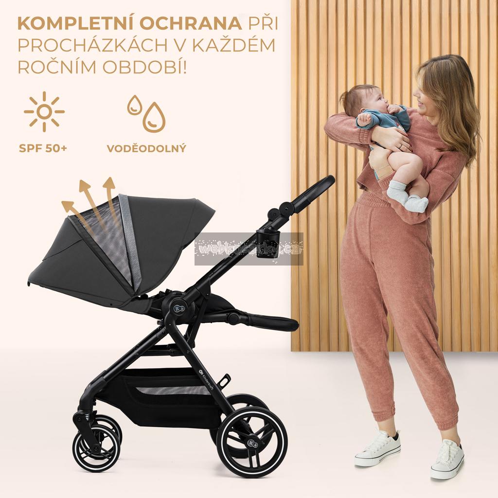 Stříška kočárku je velká a nepromokavá, s filtrem UPF50+. Má dodatečný ventilační panel a okénko pro kontakt s dítětem, přes které můžete sledovat, co vaše dítě dělá.