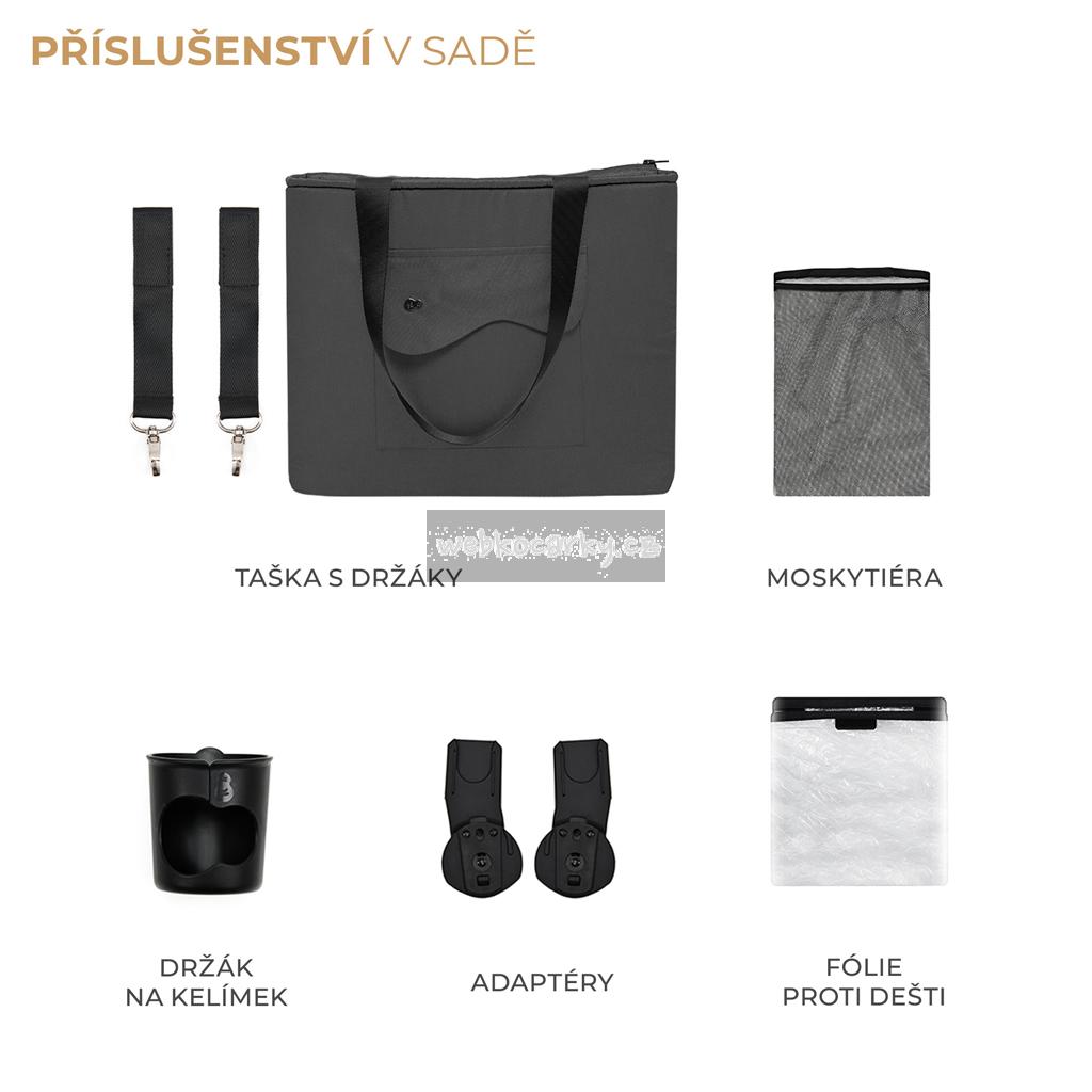Ke kočárku patří také řada praktického příslušenství, jako je moskytiéra, pláštěnka, držák na nápoje, taška na rukojeť pro rodiče a adaptéry na autosedačku. Pokud již máte dětskou autosedačku, můžete z ní díky adaptérům vytvořit TRAVEL SYSTEM. A to vše v jednom kočárku!