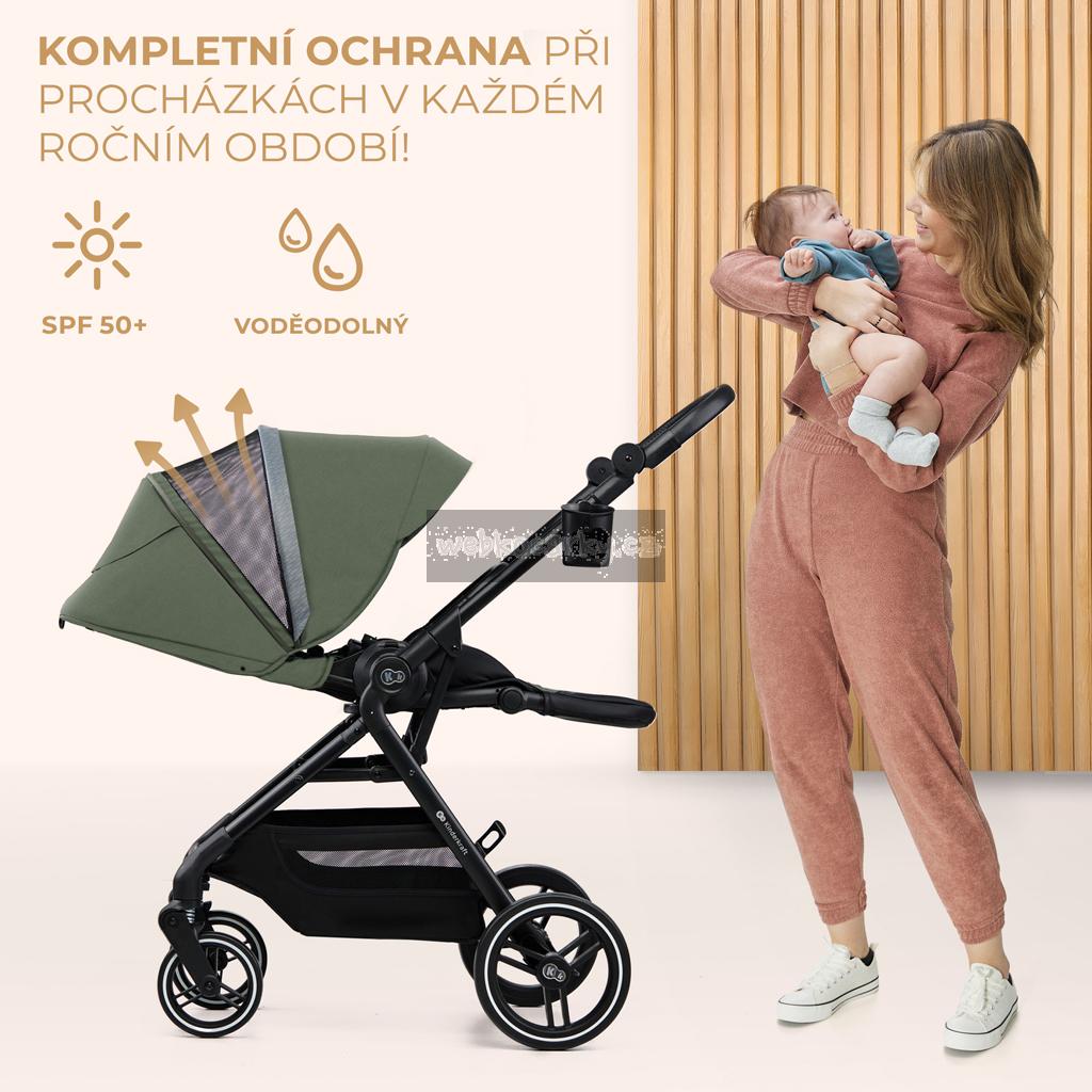 Stříška kočárku je velká a nepromokavá, s filtrem UPF50+. Má dodatečný ventilační panel a okénko pro kontakt s dítětem, přes které můžete sledovat, co vaše dítě dělá.