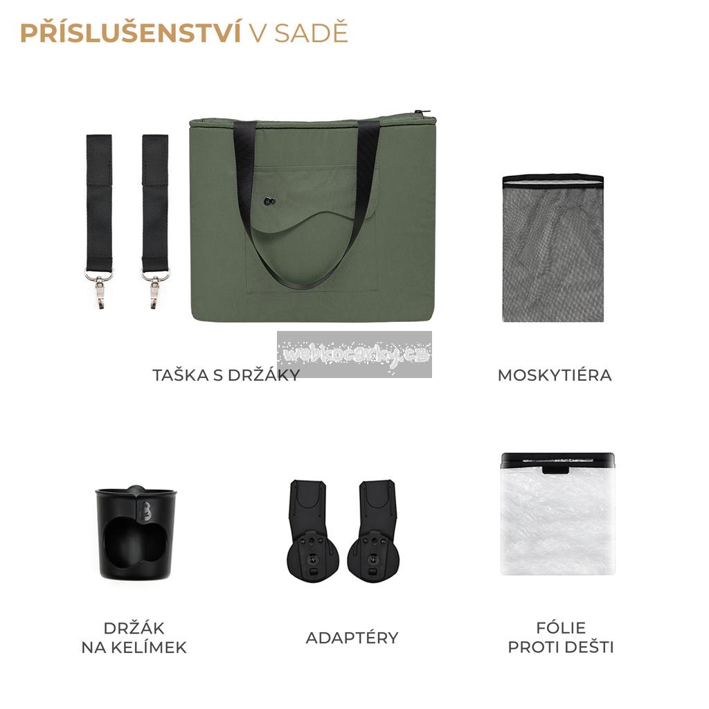 Ke kočárku patří také řada praktického příslušenství, jako je moskytiéra, pláštěnka, držák na nápoje, taška na rukojeť pro rodiče a adaptéry na autosedačku. Pokud již máte dětskou autosedačku, můžete z ní díky adaptérům vytvořit TRAVEL SYSTEM. A to vše v jednom kočárku!