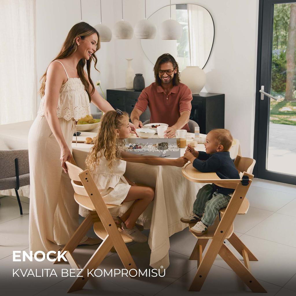 Existuje vůbec jídelní židlička, která bude sloužit vašemu dítěti několik let? Ano! Právě takovou židlí je ENOCK. Tento nadčasový kus nábytku je bezpečnou a praktickou vysokou jídelní židličkou i ergonomickou židlí pro starší děti. Jak je to možné? Výška sedáku a opěrky nohou je nastavitelná, což usnadňuje nastavení židle podle věku dítěte. ENOCK je navržena s ohledem na vaši rodinu - je to vysoká židle, která se bude hodit k interiéru vašeho domova a pak bude sloužit vašemu dítěti jako hrací židle nebo ke židle ke stolu. A co víc, můžete ji snadno přizpůsobit ke stolu v kuchyni, jídelně nebo v obývacím pokoji. Díky tvarovanému opěradlu bude dítě udržovat správné držení těla při jídle a bude také moci trávit čas společně s dospělými u stolu.